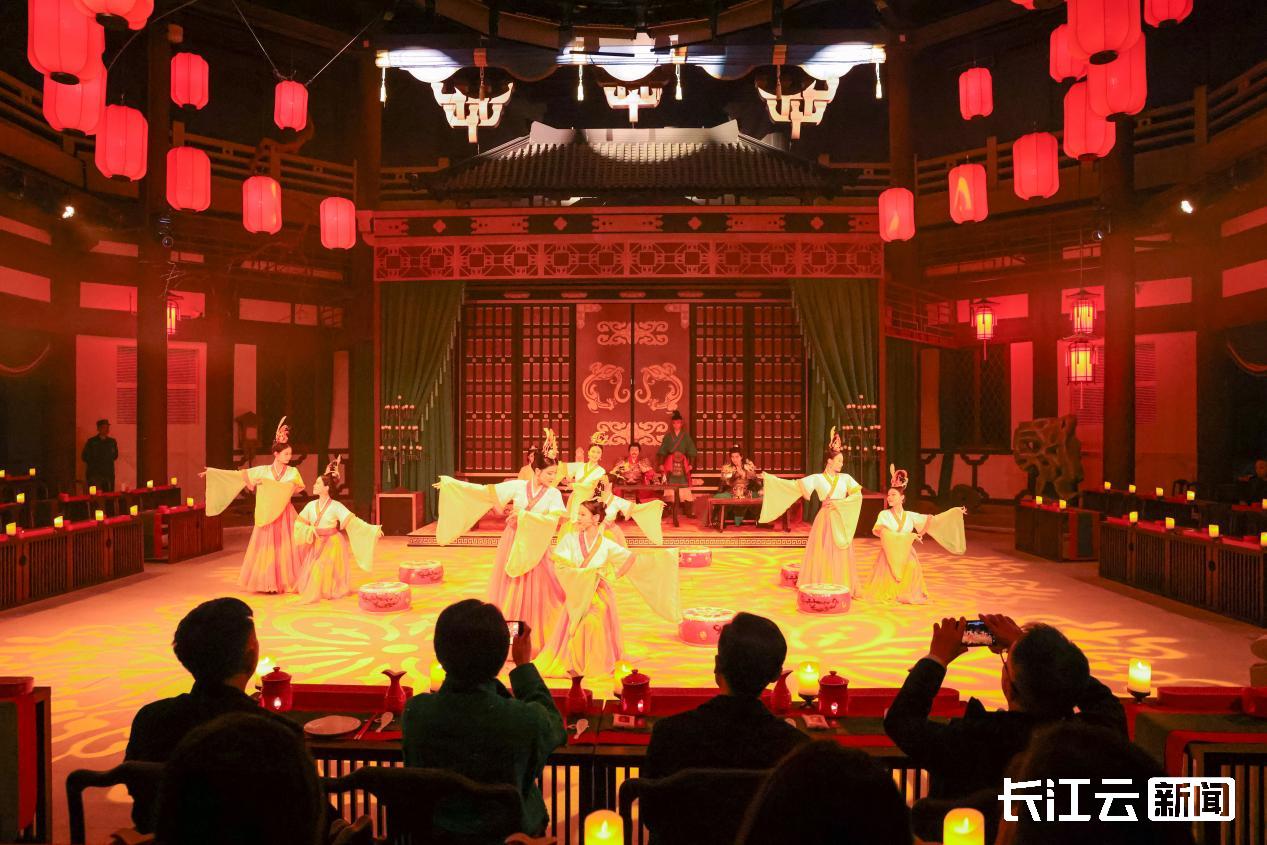 每日18:30,随着灯光渐暗,舞姬登场,五幕主题舞剧正式拉开帷幕。演出以貂蝉吕布、大乔小乔、蔡文姬等三国女性故事为主线,穿插洛神赋、鱼灯舞等特色舞段,画风唯美。每段演出结束后,NPC侍女会端上对应主题的荆楚特色餐食,鱼糕、藕汤、黄陂三鲜等美食与剧情深度融合,全程体验约2小时,尾声还可再次登楼欣赏夜景,沉浸式感受古今交融的魅力。