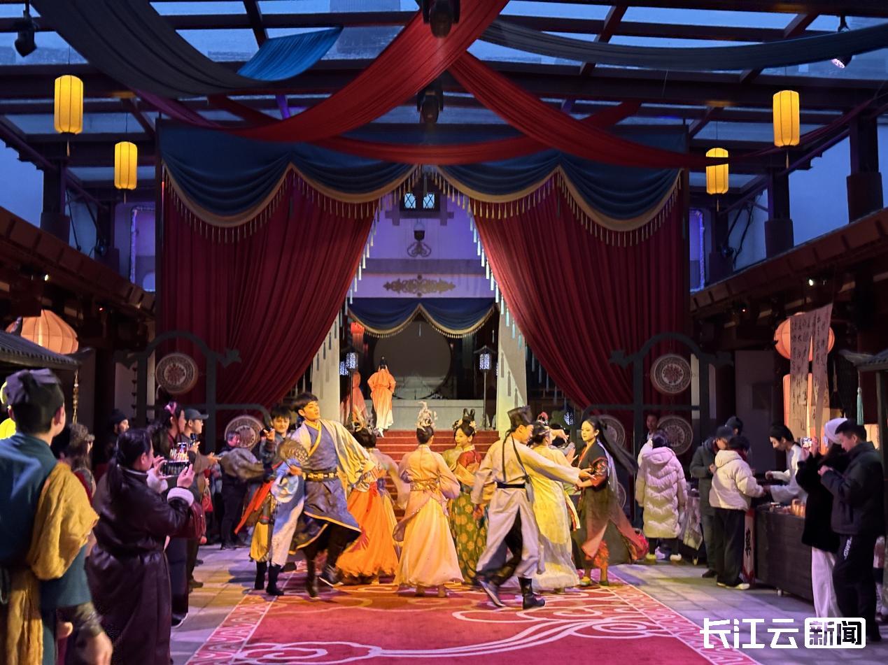 1月19日起,一层沉浸式剧游空间同步开放预约,核心体验项目为三国主题宴席“三国群芳宴”。游客需通过“知音文化旅游区”小程序预约购票,换装进入后,可参与市集逛游、NPC互动等环节——张飞邀猜拳饮酒、黄月英引导解锁九连环、华佗传授识药技巧,全程趣味十足。