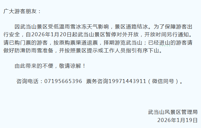 关于武当山景区临时闭园的公告