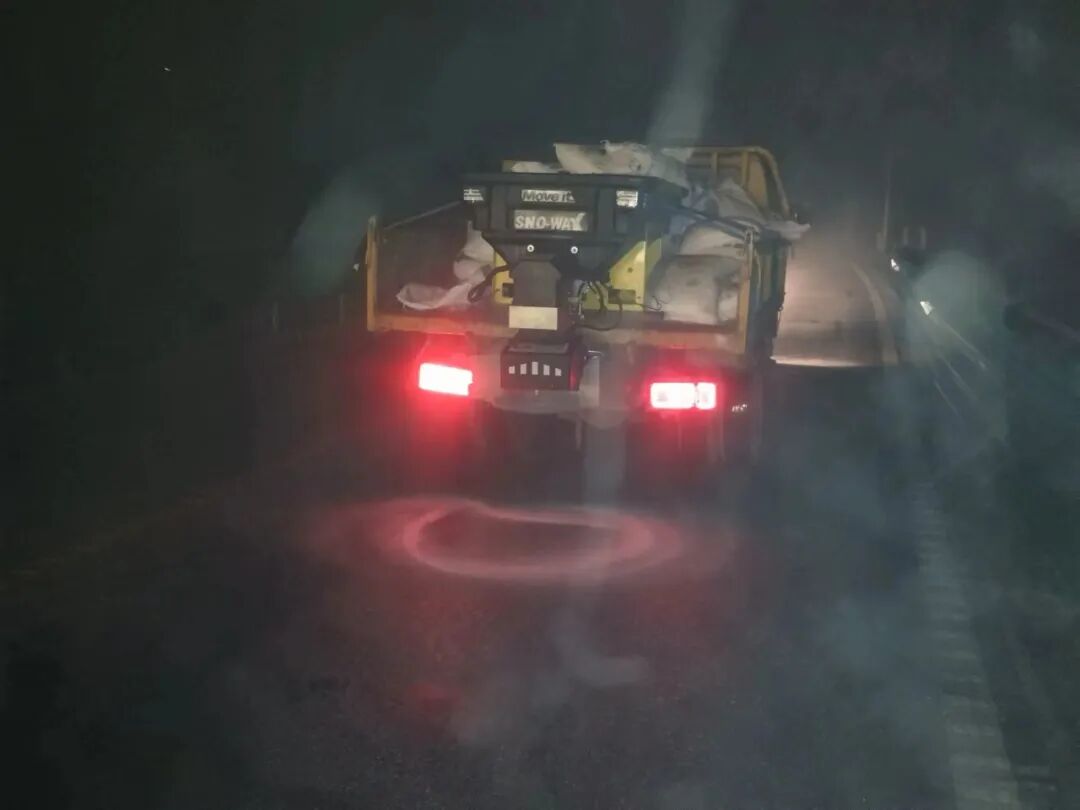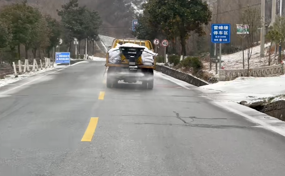 养护人员调装融雪剂,在G209雷峰垭和石南路石佛寺路段提前洒布融雪剂,消除路面结冰隐患。