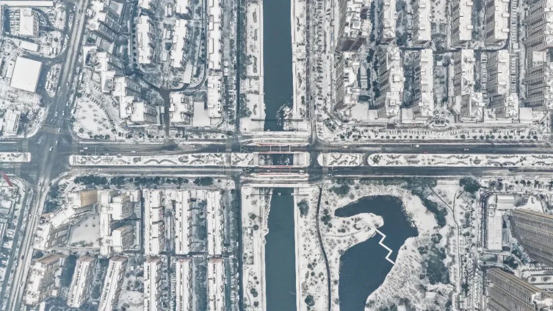 屋顶、树梢、街巷都被一层厚厚的白雪温柔包裹
