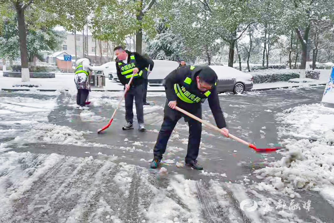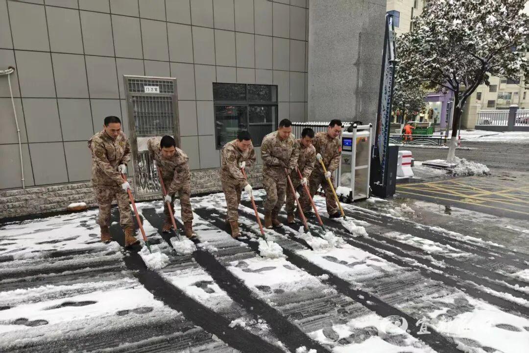 ▲为保障群众出行安全和交通畅通,宜都市人武部迅速响应,组织民兵开展扫雪除冰工作。