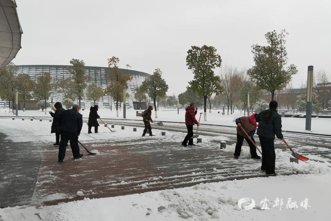 ▲宜都市文化和旅游局组织干部职工开展公共服务场所、包联小区、人行道路段等地的除雪保畅工作。