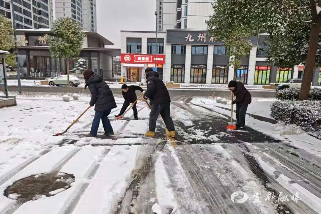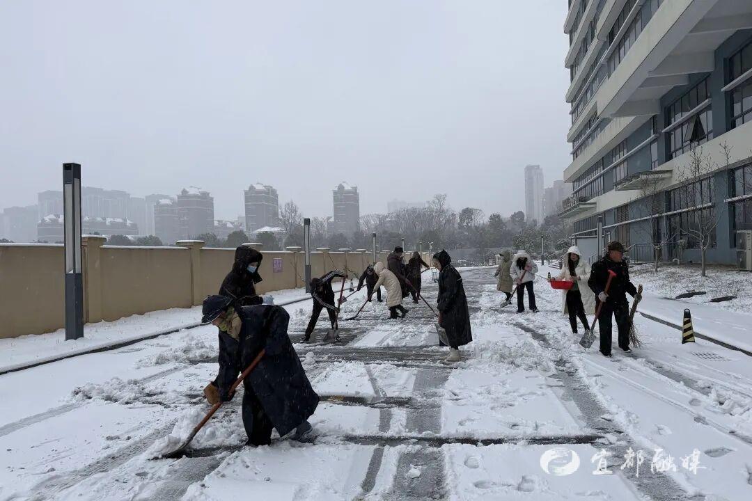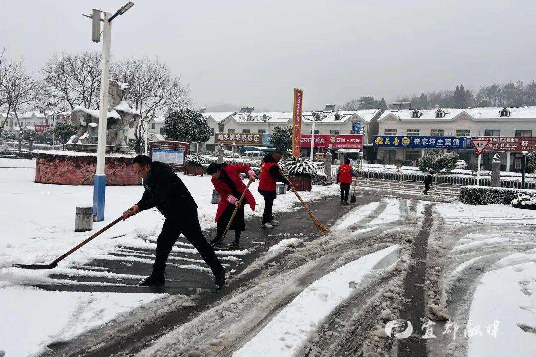 ▲宜都市姚家店镇及各村社区组织干部、网格员清理小区内及重要道路积雪,确保群众出行安全。