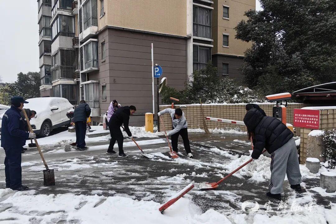 ▲宜都市住建局组织党员干部清除小区,路段积雪,确保出行安全。