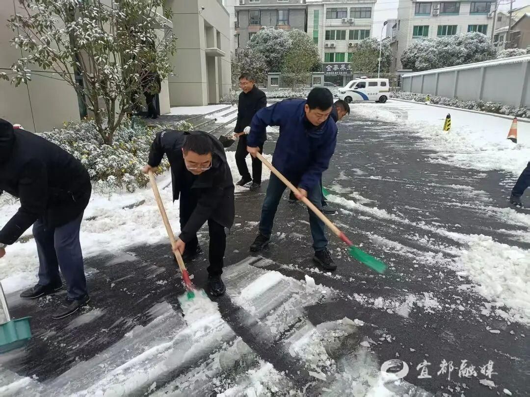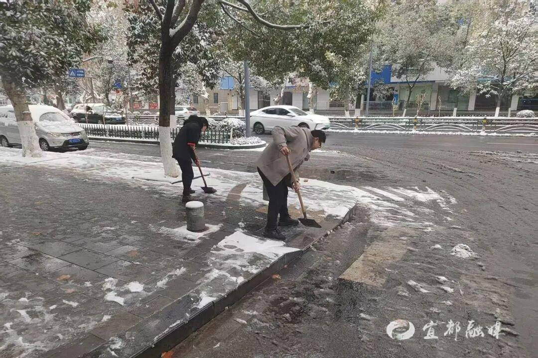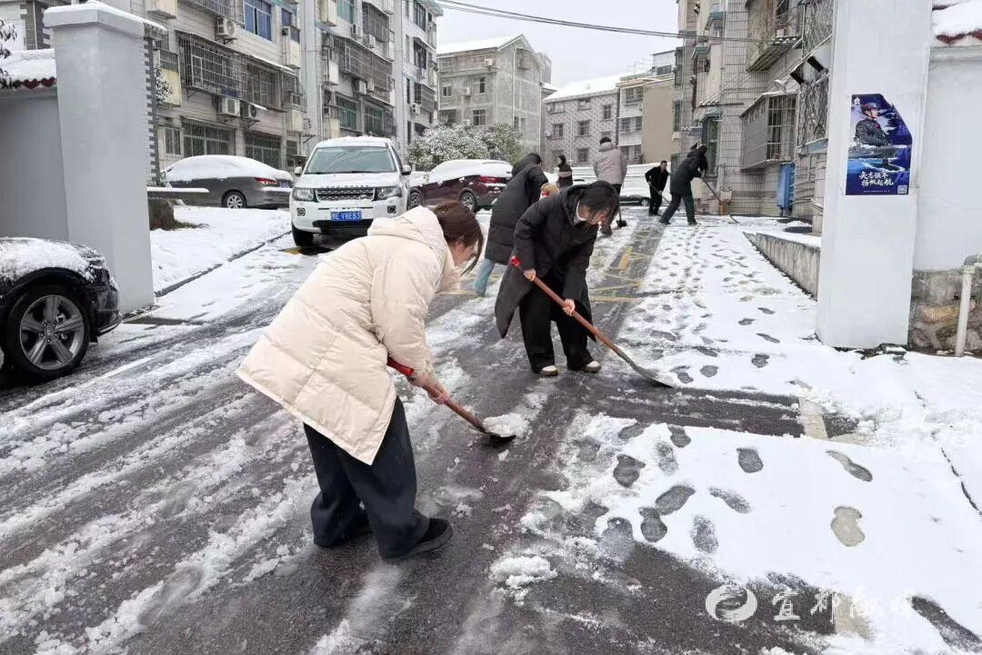▲宜都市自然资源和规划局组织干部职工到包联小区及包联路段,开展积雪清扫工作。