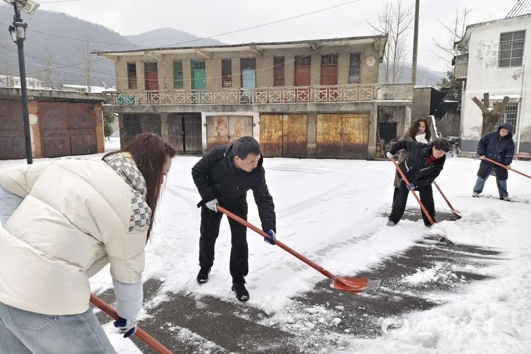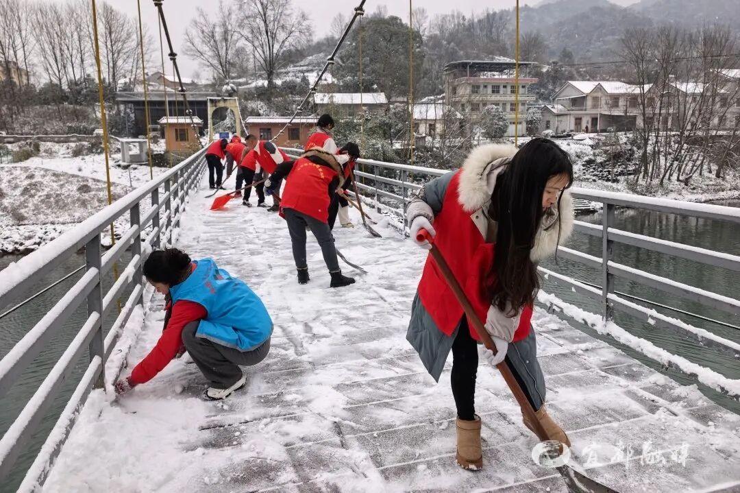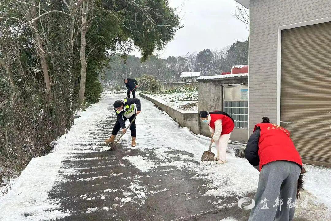 ▲宜都市高坝洲镇及各村社区组织干部、志愿者开展道路除雪,同时走访五保户了解其住房安全及生活保障情况。