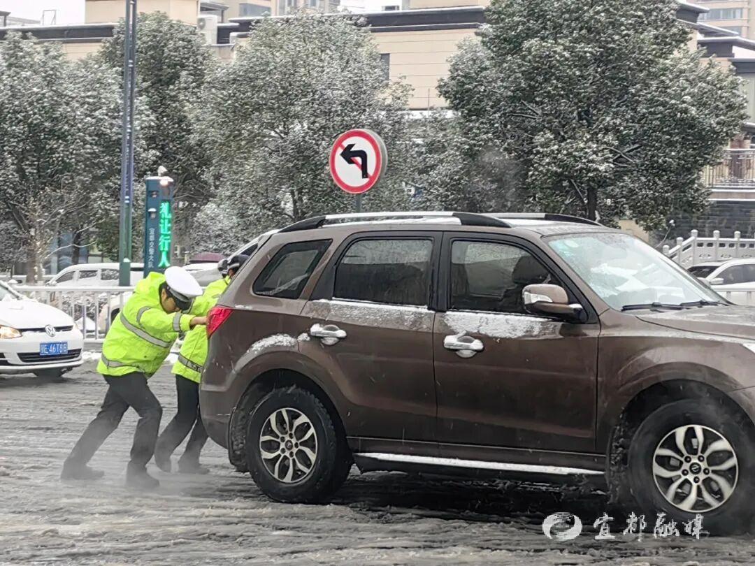 ▲宜都公安加强主干道和重点路段疏导管控,出动警力500余人,救助群众20余起。同步开展铲雪、撒盐、协助安装防滑链条等工作,提醒驾驶员减速慢行、保持安全车距,确保道路安全畅通。