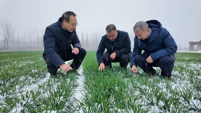 在城关镇小麦种植基地,指导组一行冒着积雪深入田间,查看麦苗长势、土壤墒情情况。针对部分晚播麦田苗情较弱的问题,农技专家现场示范中耕和划锄技巧。