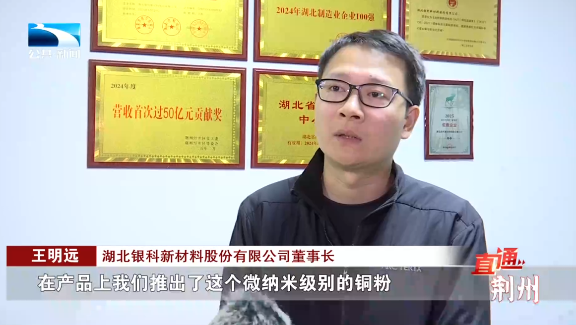 湖北银科新材料股份有限公司董事长 王明远:在产品上我们也推出了这个微纳米级别的铜粉和银包铜粉体,我们纳米银粉跟片状银粉主要是在大功率半导体的封装上,用作散热材料和金属物联这一部分,我们的这个在新能源汽车上,主要是铜粉,应用在被动元器件的电感、电容、电阻。