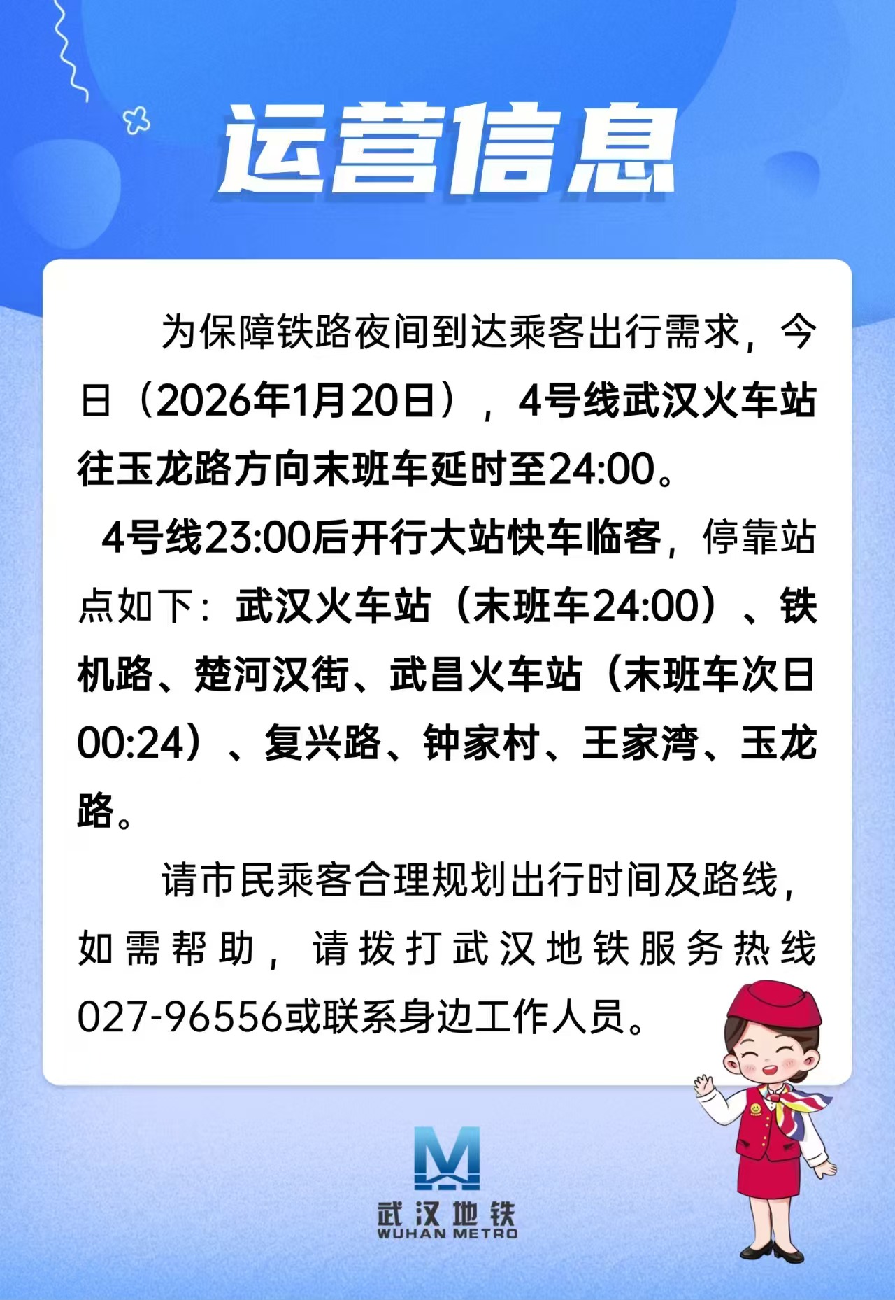 长江云新闻记者从武汉地铁运营公司获悉,为保障铁路夜间到达乘客出行需求,今日(2026年1月20日),4号线武汉火车站往玉龙路方向末班车延时至24:00。