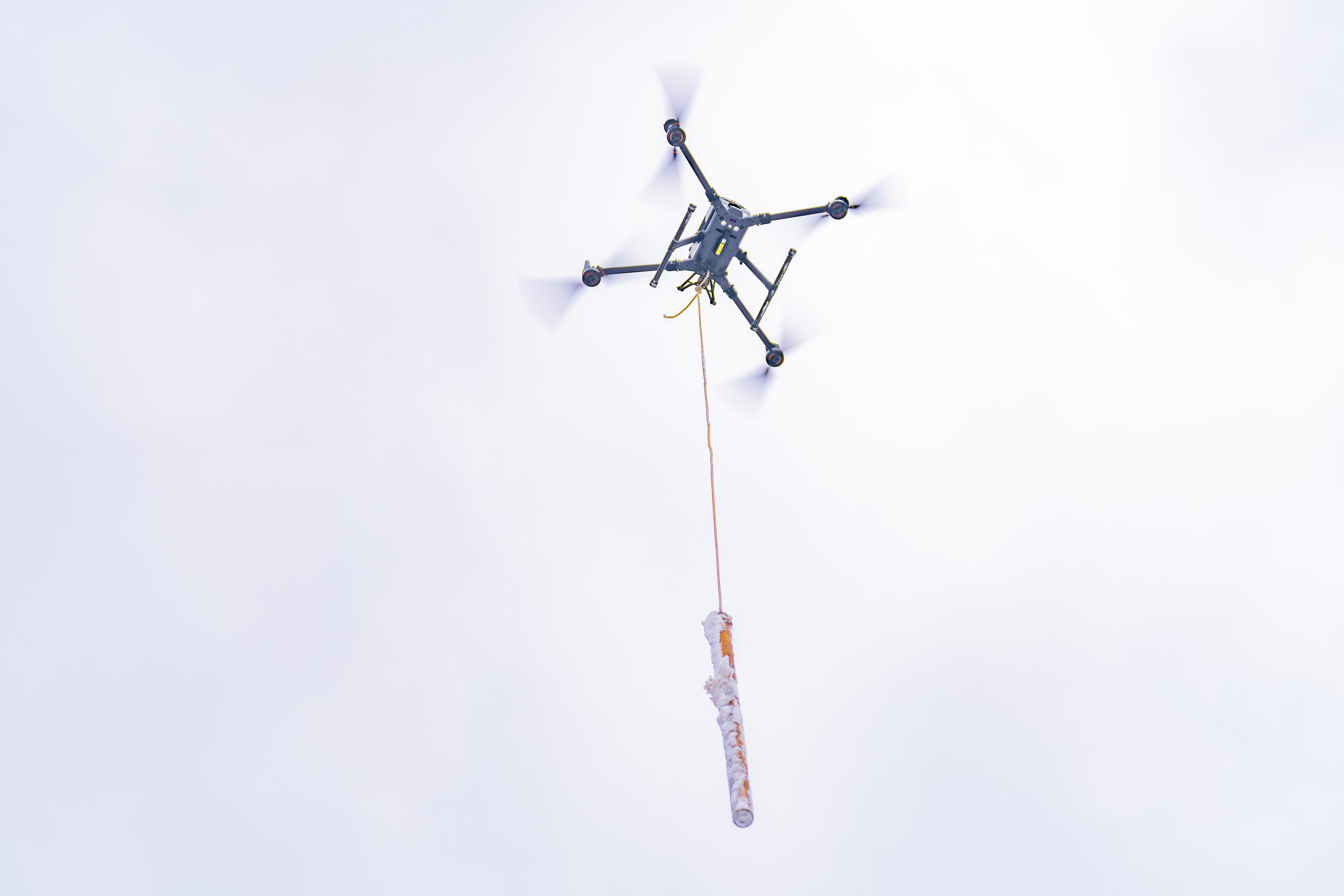 站在输电线路之下,肉眼可见导线上已经附着有颗粒状的冰层。经过对导地线周围雪域环境的严格考量,国网武汉供电公司输电运检分公司运检六班班员柴进操控起无人机升空进行作业。在无人机的下方,挂着一根粗壮的除冰器,接下来就将通过它与输电导线的撞击,来清除覆冰。