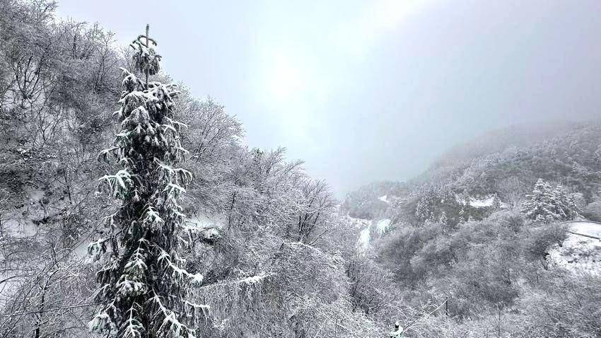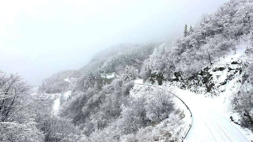 航拍镜头下,连绵山峦如被素纱轻覆,蜿蜒的盘山公路似银带穿梭于林海,勾勒出“山舞银蛇”的壮阔轮廓,每一处景致都藏着让人驻足沉醉的韵味。