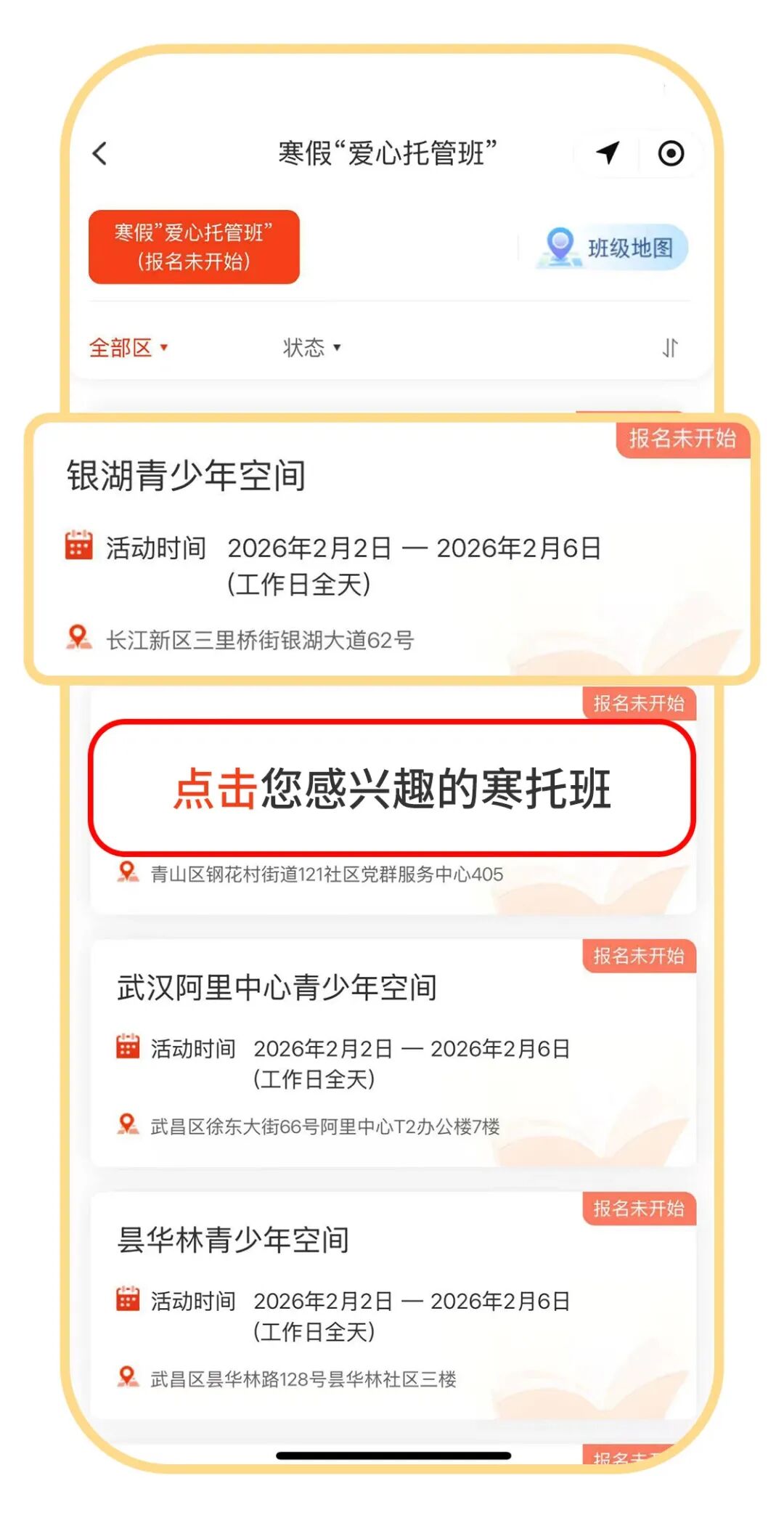 家长可在报名界面点击“查找”后,根据各托管班位置信息选择合适的托管班报名。考虑到冬季天气多变,建议家长充分考虑路途交通等安全因素。