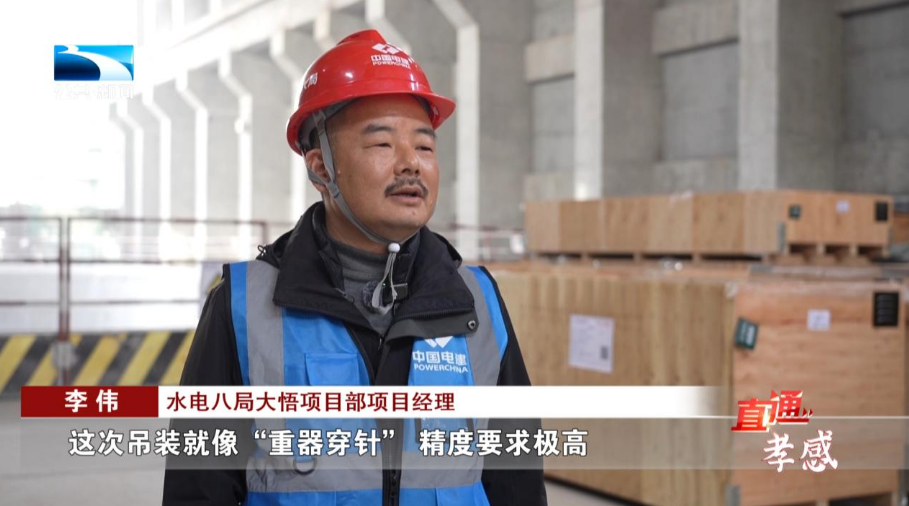 水电八局大悟项目部项目经理 李伟:这次吊装就像“重器穿针”精度要求极高,我们提前用BIM技术反复模拟,现场全程数字化监控,确保这个“大家伙”下沉50米的过程中,水平误差不超过0.5毫米,为全年建设开了个好头。