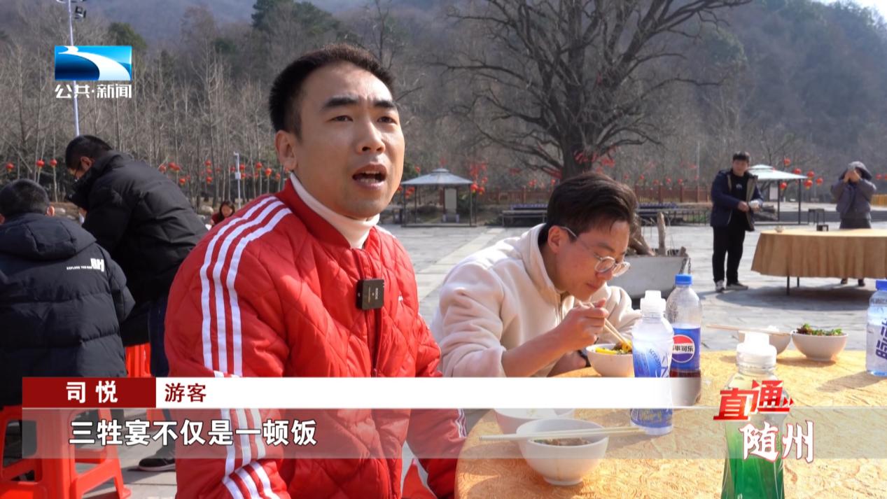 游客 陶卓:唱了一首带马的歌曲,免费进到大洪山景区,来了之后还听说景区,刚好今天还有活动 三牲宴,我们等一下,我也准备去景区尝一下三牲宴。