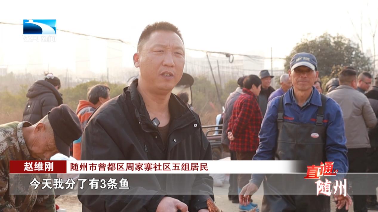 随州市曾都区周家寨社区五组居民 赵维刚:今天我分了有3条鱼,大概有17斤,中秋节的时候,我们也分了有三四条鱼,老百姓都比较高兴。