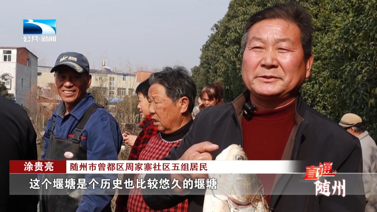 随州市曾都区周家寨社区五组居民 涂贵亮:这个堰塘是个历史也比较悠久的堰塘,大概在个20 亩左右 水质很好,养的鱼很大,又漂亮,平常也是几个村民互相照顾的,才有今天好结果,(大家)都很欢喜的。