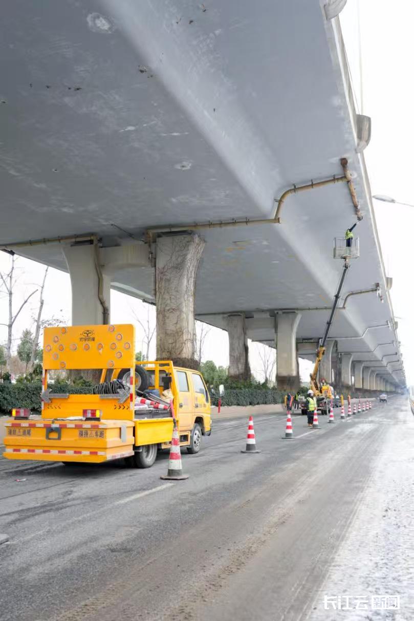 针对高架桥桥下冰凌情况,自19日凌晨,武汉市城市道路桥隧事务中心组织相关桥隧管养单位出动巡查人员604人次,车辆178台次,采取“车辆巡查+人工检查”“重点盯防+全面覆盖”相结合的方式,对桥梁易结冰部位实施动态巡查。管养人员顶风冒雪,高效协作,采用登高车、伸缩除冰杆、伸缩抄网等设备,完成了长江二桥汉口岸黄浦立交、岳家嘴立交、航空路立交、武胜路高架、汉口站地下通道等桥隧1033处冰凌清除作业,及时消除了悬冰坠落对道路交通和行人安全的潜在威胁。
