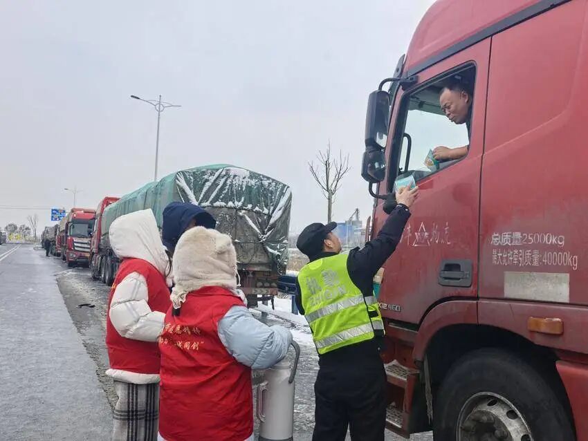 现场寒风凛冽,暖流却悄然涌动。工作人员分工协作,有的提着开水壶、抱着泡面箱在车流间穿梭,有的一边细心询问司机需求,一边冲泡泡面、递上热饮,告知路况信息、叮嘱大家注意防寒防滑。