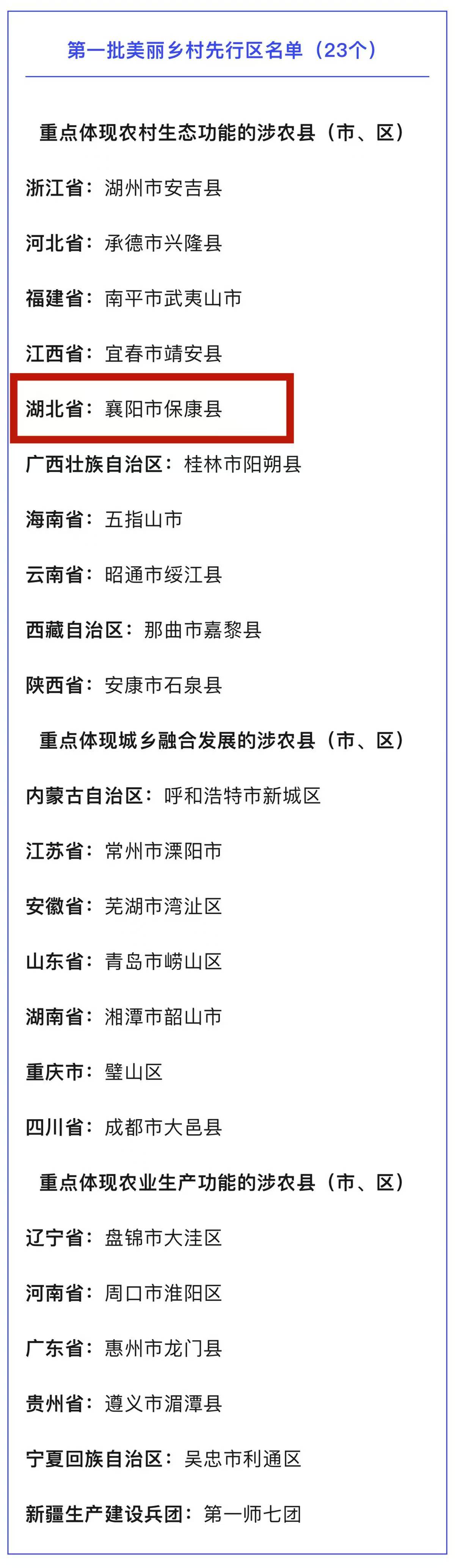 1月21日,生态环境部发布第一批美丽乡村先行区名单,襄阳保康县作为湖北省唯一入选的县(市、区),与浙江安吉、福建武夷山等全国23个县(市、区)共同获此殊荣。