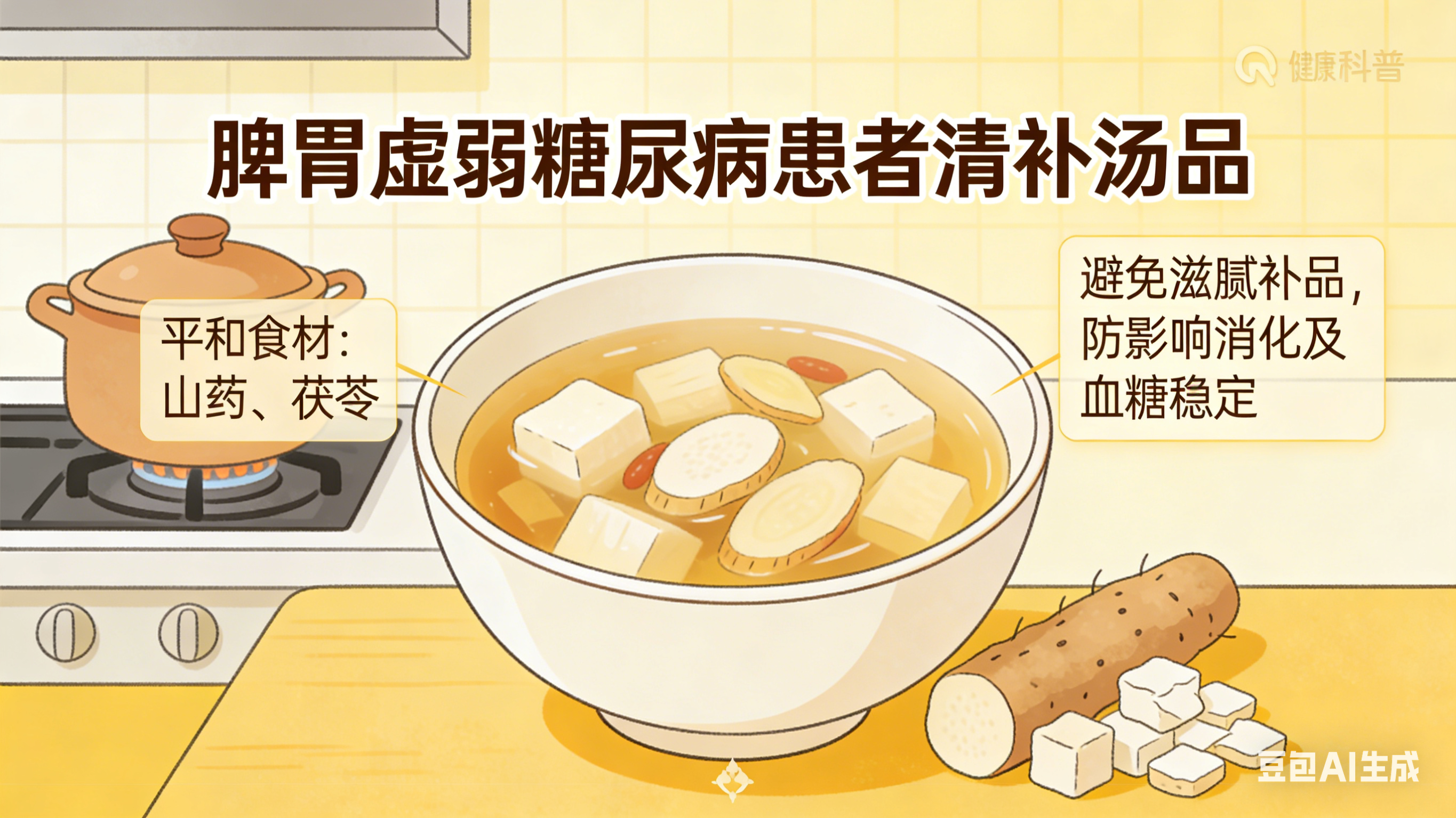 对于脾胃虚弱的糖尿病患者,选择性质平和的食材,如山药、茯苓等,制成清补汤品。避免使用过于滋腻的补品,以免影响消化功能和血糖稳定。