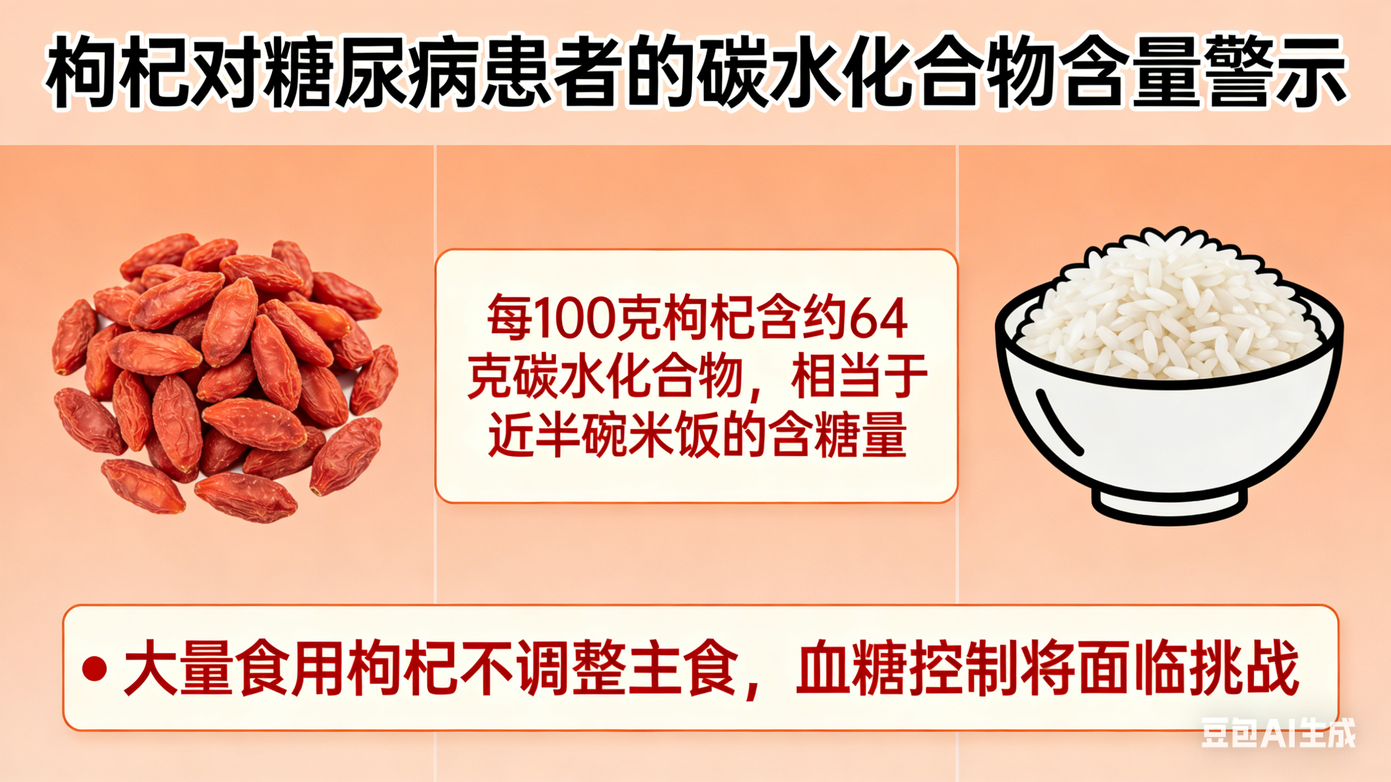 即使是相对温和的枸杞,对糖尿病患者也是潜在的威胁——每100克枸杞含有约64克碳水化合物,相当于近半碗米饭的含糖量。如果大量食用而不调整主食,血糖控制将面临挑战。