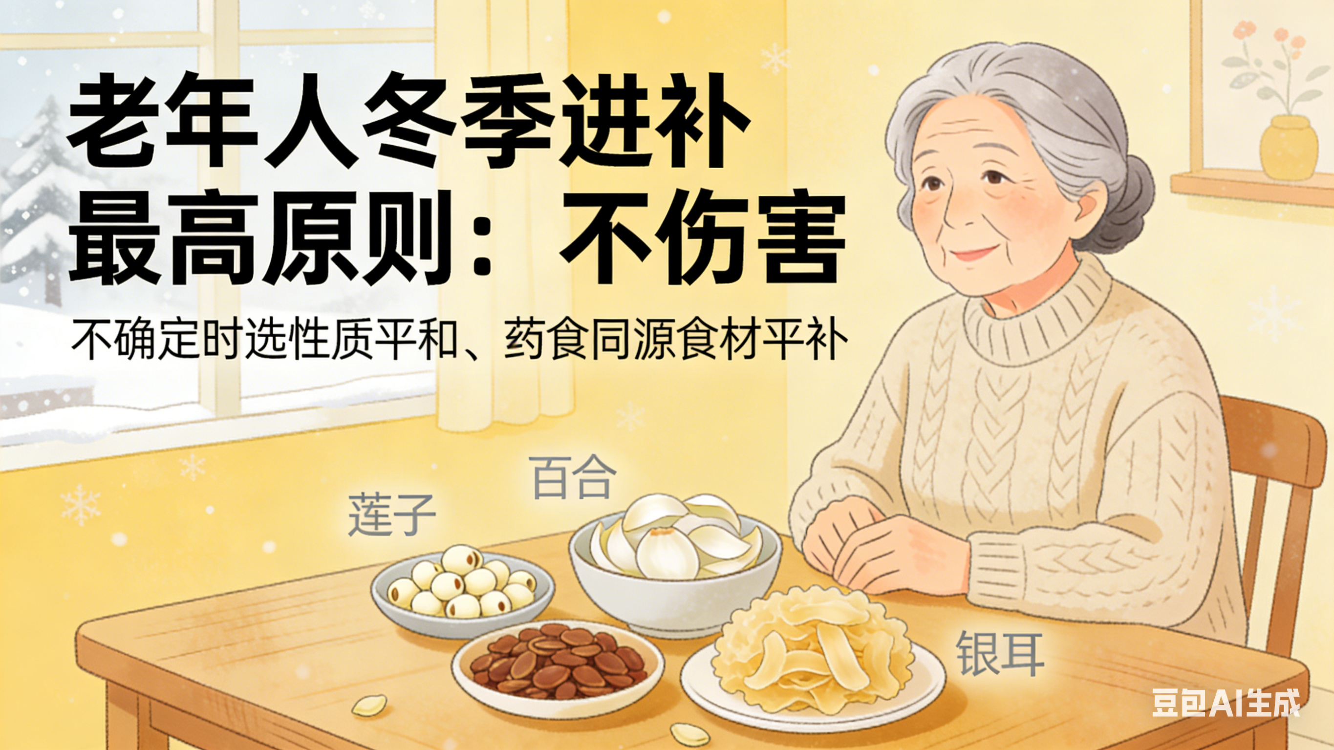 老年人冬季进补的最高原则应当是“不伤害”。在不确定的情况下,选择性质平和、药食同源的食材,如莲子、百合、银耳等,进行平补。