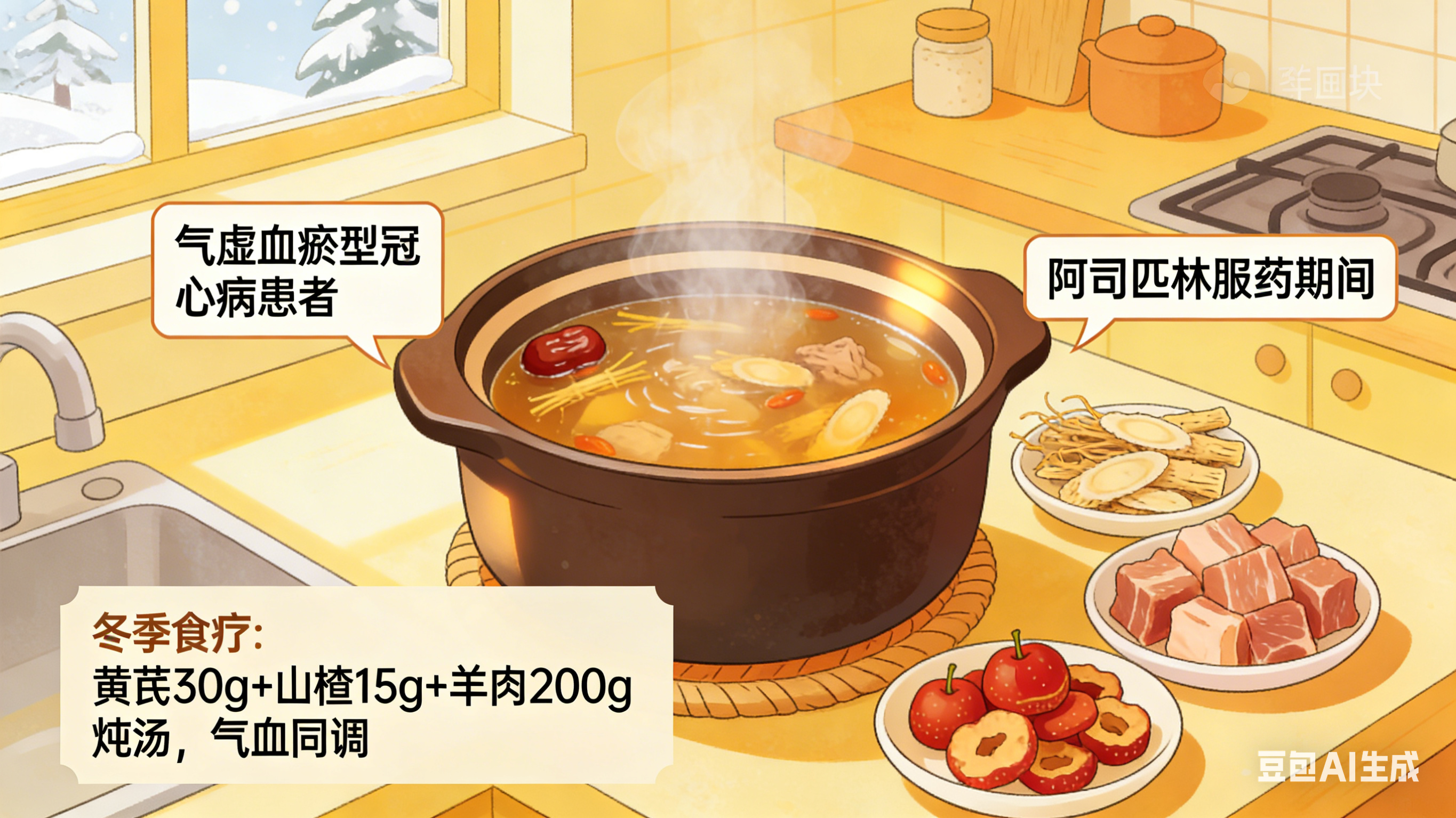 以一位气虚兼有血瘀的冠心病患者为例,在服用阿司匹林期间,冬季食疗可以选择“气血同调”的黄芪搭配山楂炖汤。
