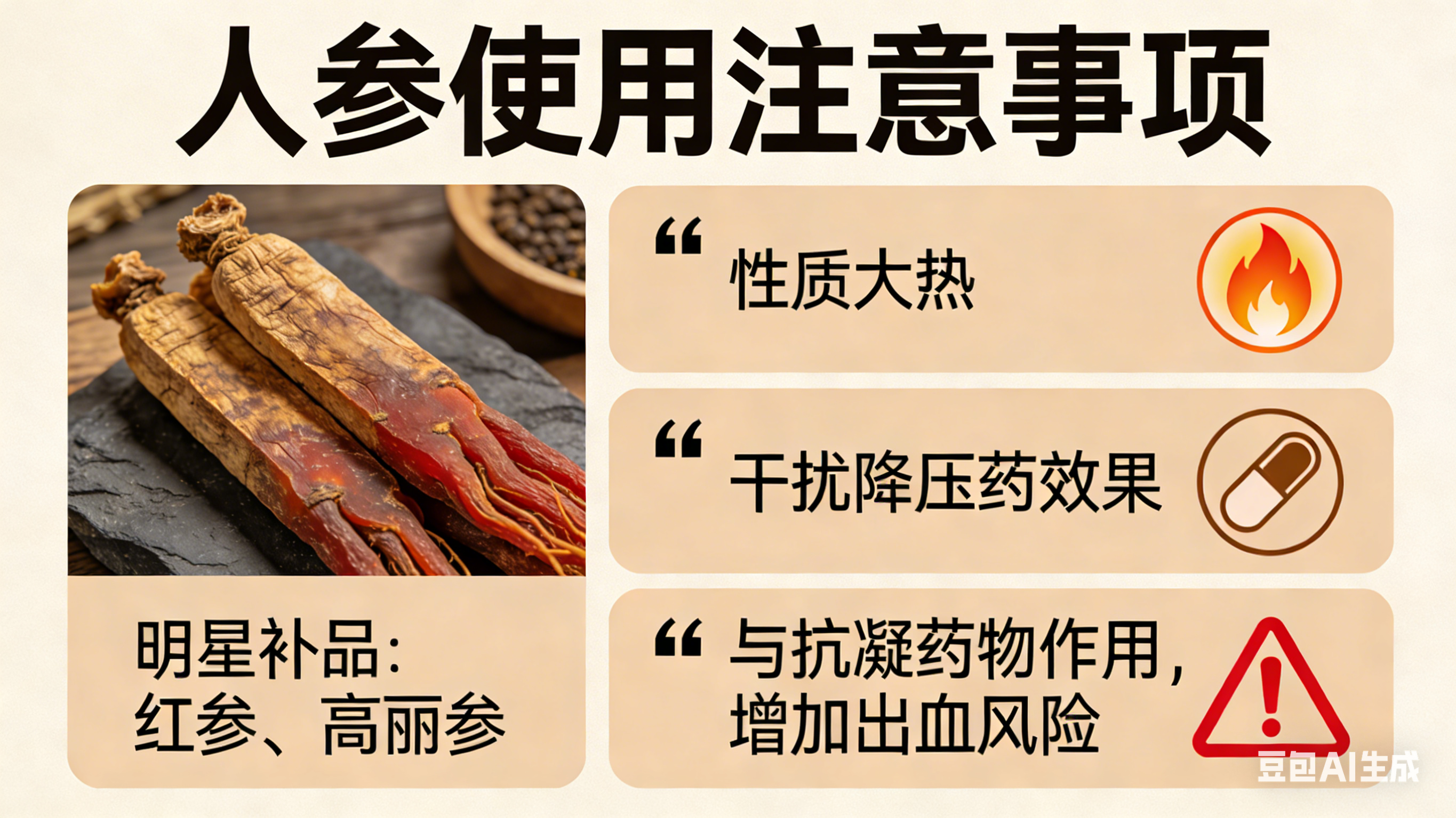 另一味“明星补品”人参,尤其是红参和高丽参,性质大热,不仅可能干扰降压药效果,还会与抗凝药物产生作用,增加出血风险。