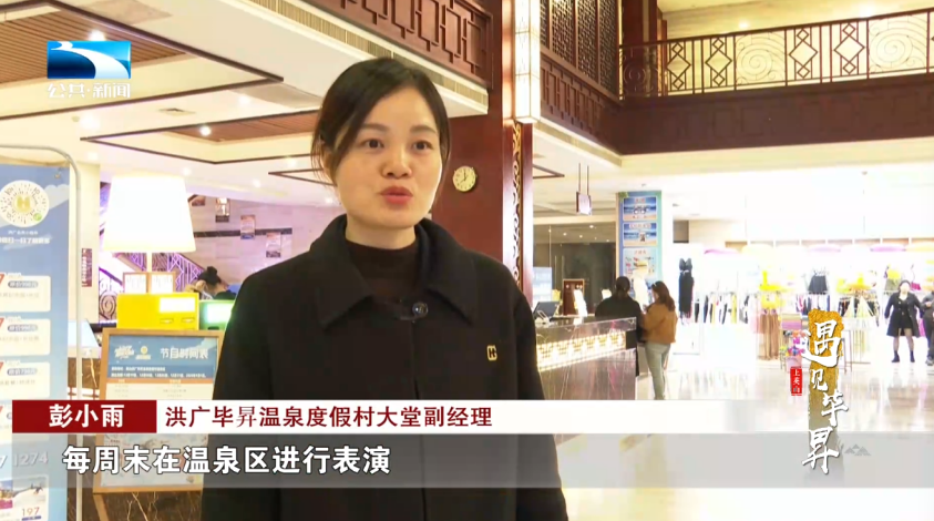 洪广毕昇温泉度假村大堂副经理 彭小雨:每周末在温泉区进行表演,同时今年我们也和其他景区进行了一些套票的联动,让游客从往常的一日游,到现在的两日游、三日游。