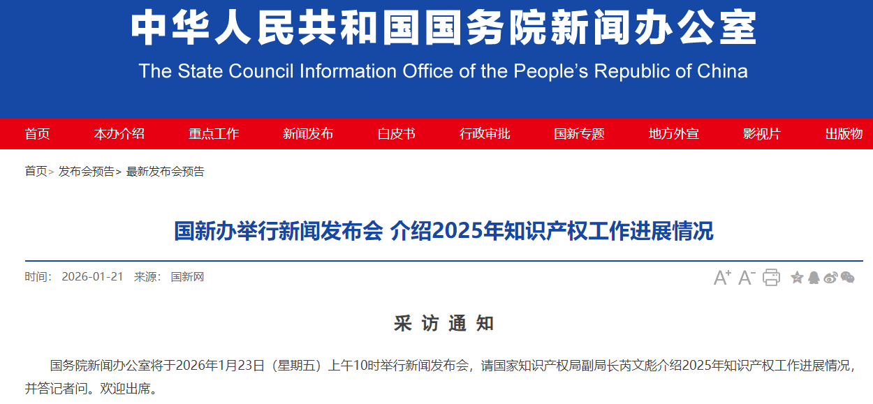 国务院新闻办公室将于2026年1月23日(星期五)上午10时举行新闻发布会,请国家知识产权局副局长芮文彪介绍2025年知识产权工作进展情况,并答记者问。