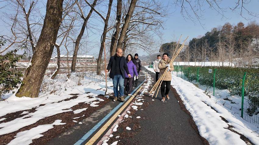 在玉皇剑茶园,市农科院茶叶专家俯身察看茶树生长状况,一边用手拨开茶蓬仔细观察芽叶长势,一边向茶园技术人员和茶农讲解冻害识别方法。针对阴坡茶园仍有残留积雪的问题,专家现场示范人工抖落积雪的正确方式,强调“要顺着枝条长势轻抖,避免用力过猛折断枝条,同时清理茶园沟渠,防止融雪积水冻伤根系”。