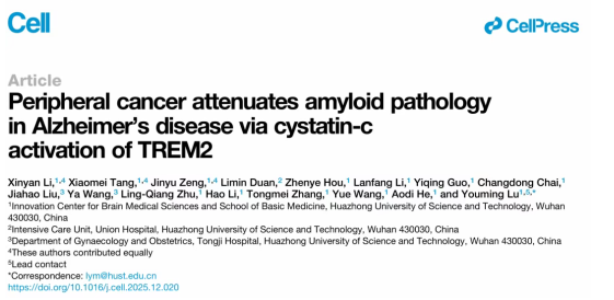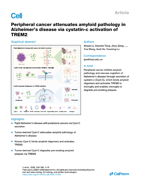 研究成果以“Peripheral cancer attenuates amyloid pathology in Alzheimer's disease via cystatin-c activation of TREM2”为题在《Cell》发表。展望未来,基于Cyst-C的药物开发、转化研究、精准治疗策略等将成为攻关重点。随着研究深入,我们有望看到基于这一机制的创新疗法进入临床,为全球数千万患者带来福音。