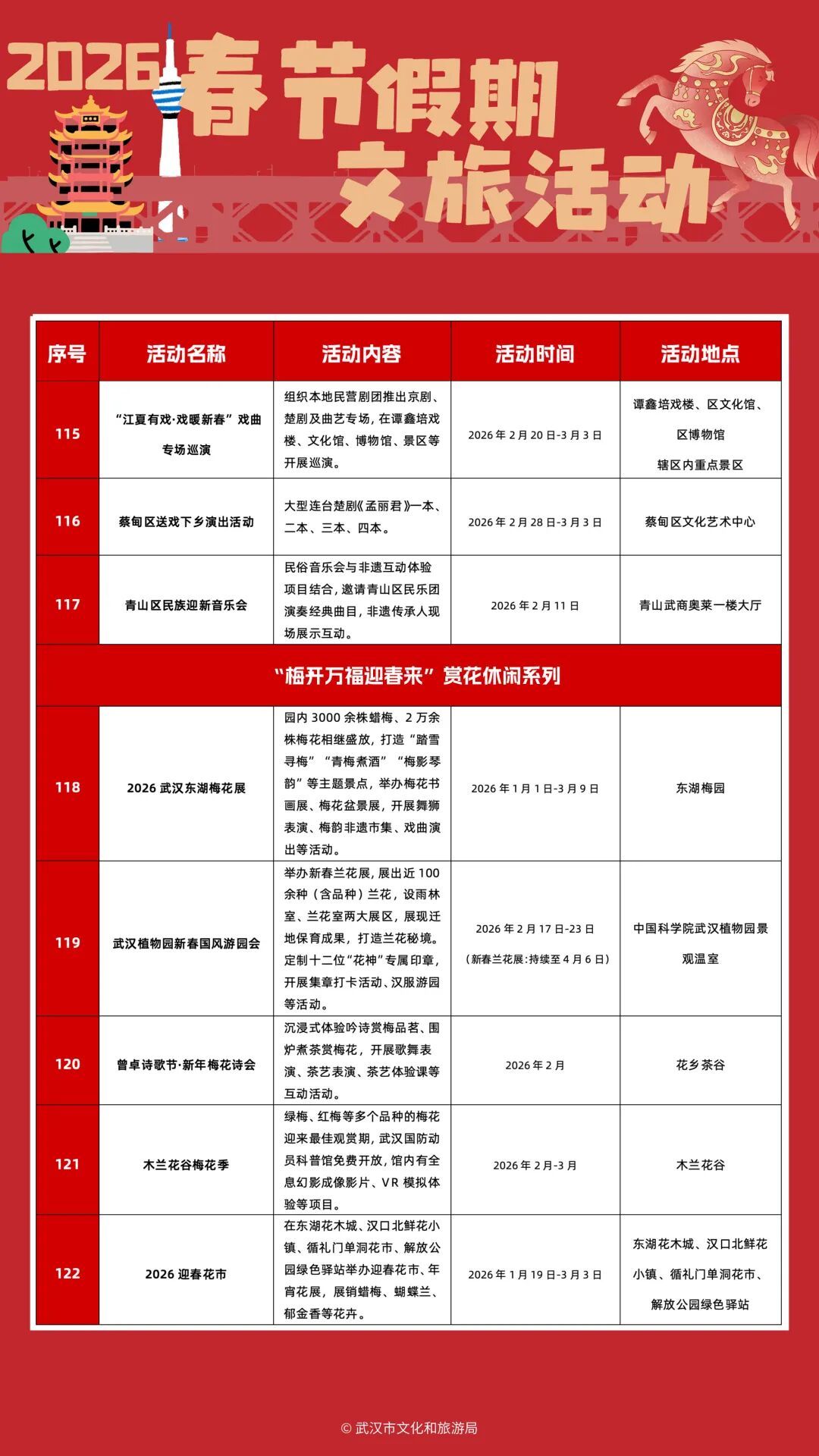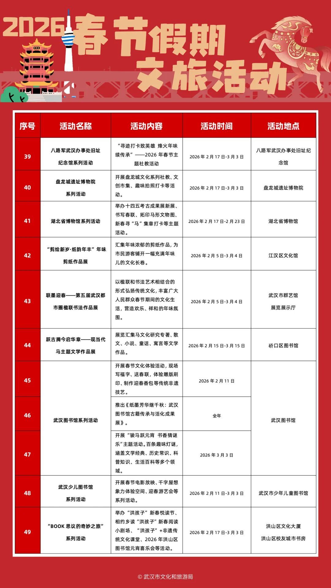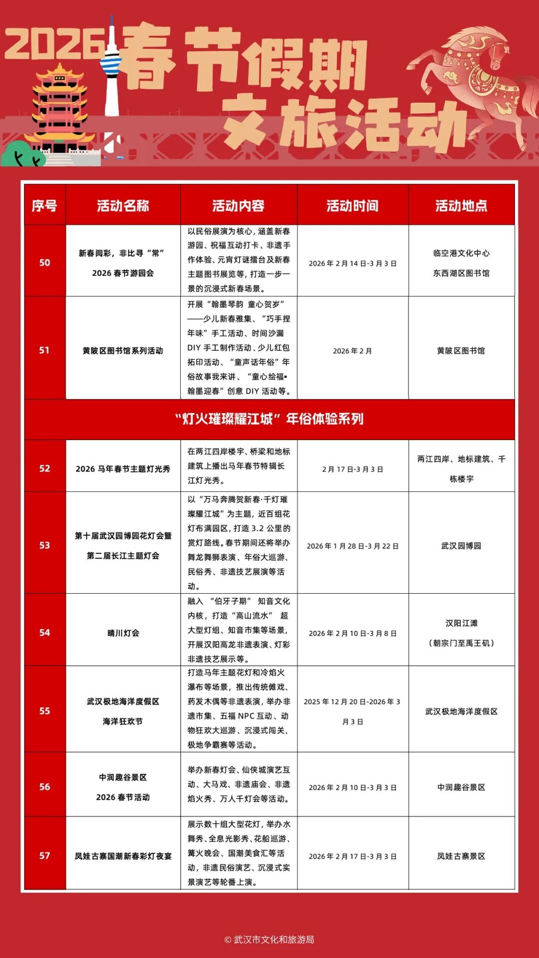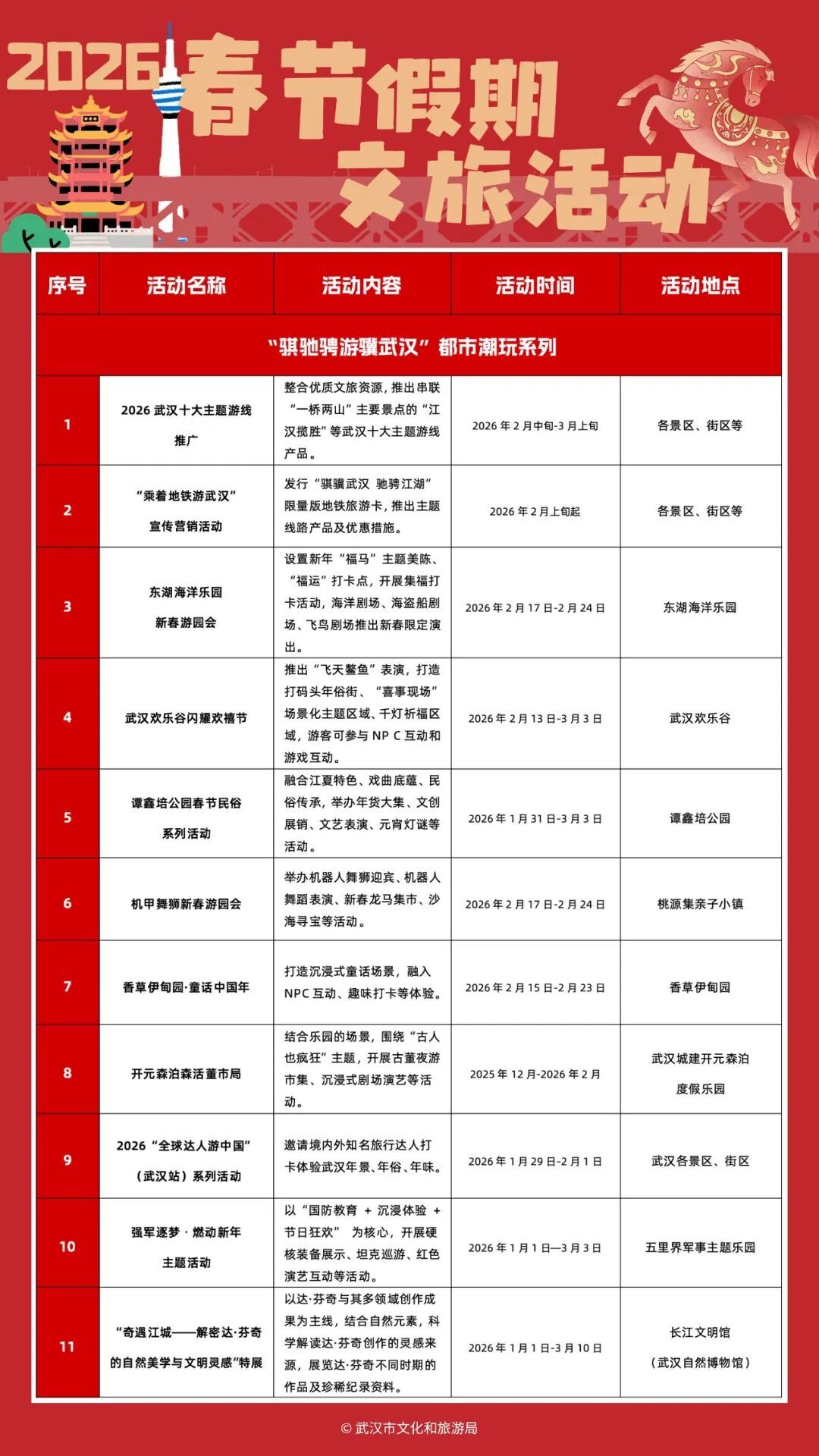 活动之外,春节游武汉的攻略也已备好,2026武汉十大主题游线、“骐骥武汉 驰骋江湖”春节限量版地铁旅游卡,都安排上了。诚邀世界各地的朋友,畅游英雄城,欢乐过大年。