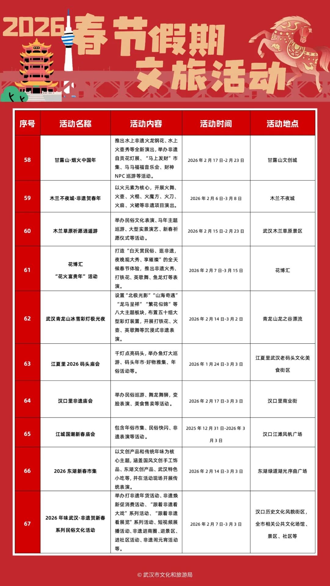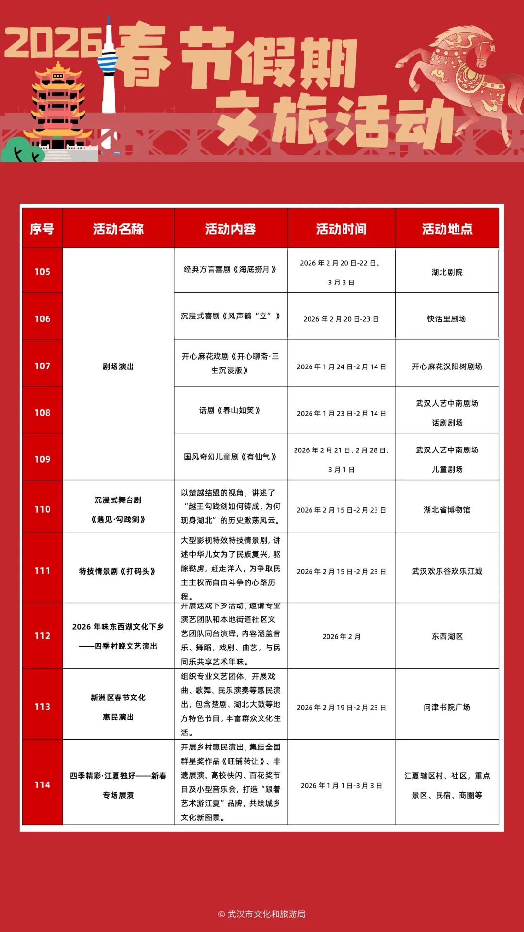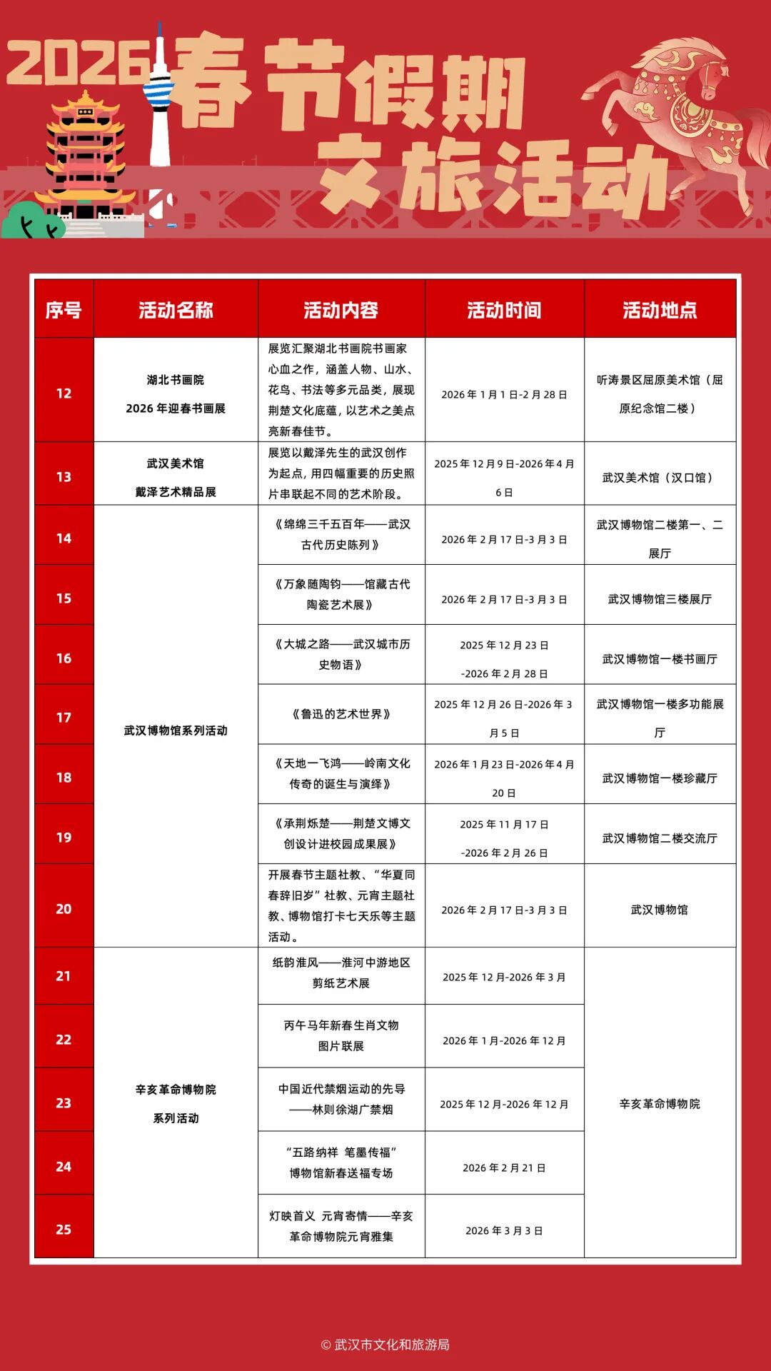 活动之外,春节游武汉的攻略也已备好,2026武汉十大主题游线、“骐骥武汉 驰骋江湖”春节限量版地铁旅游卡,都安排上了。诚邀世界各地的朋友,畅游英雄城,欢乐过大年。