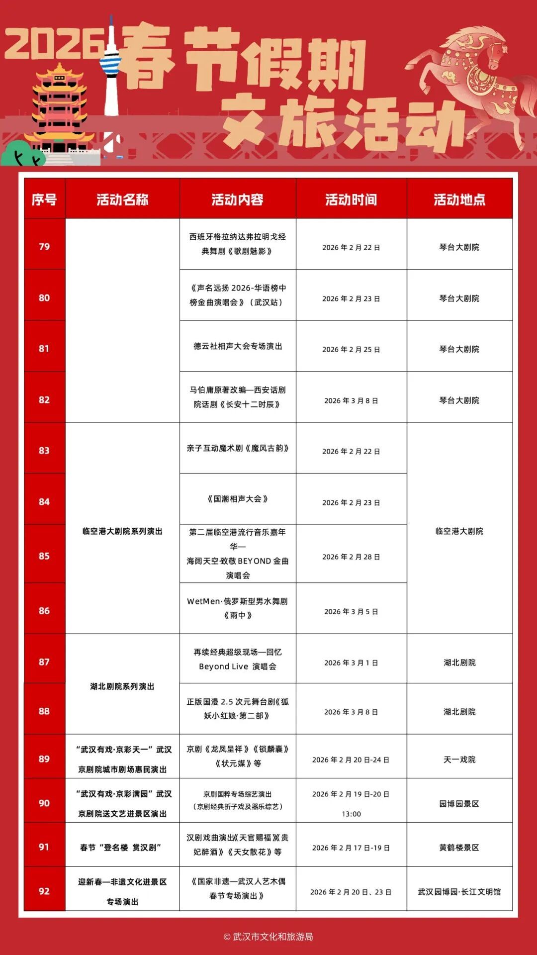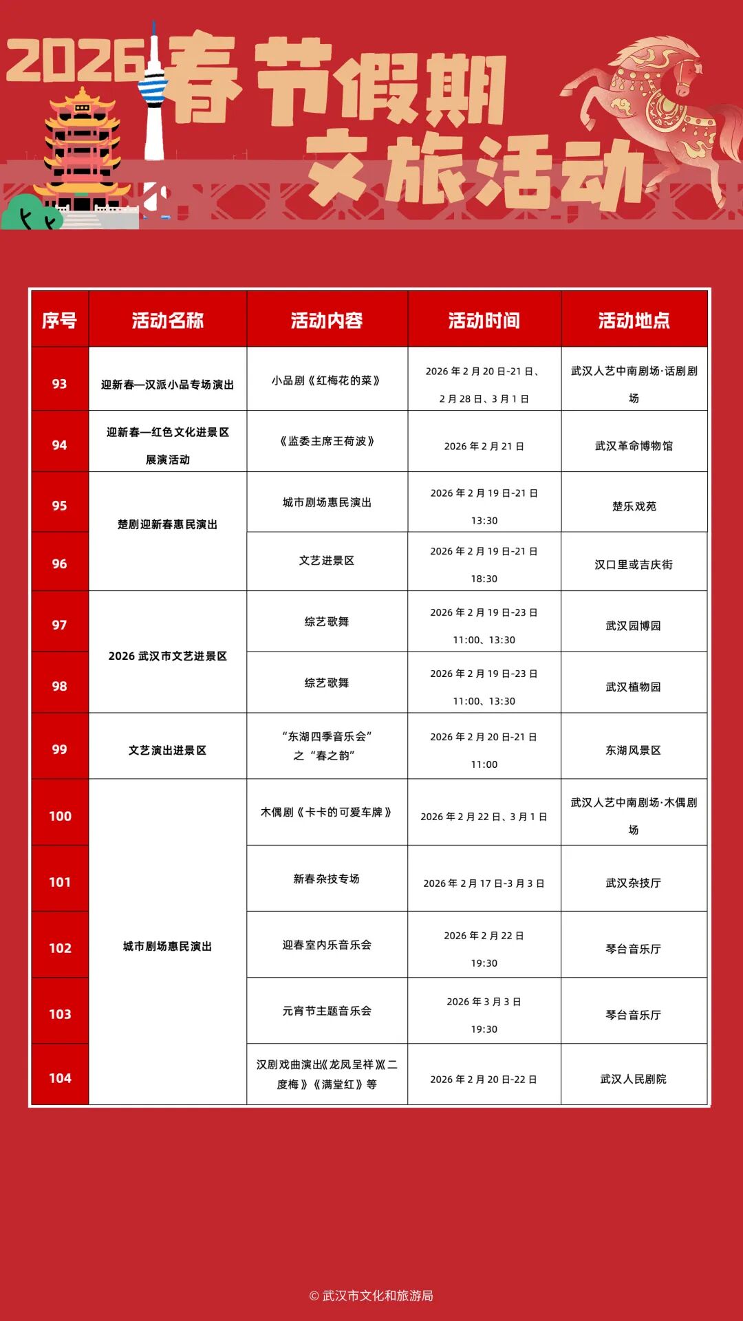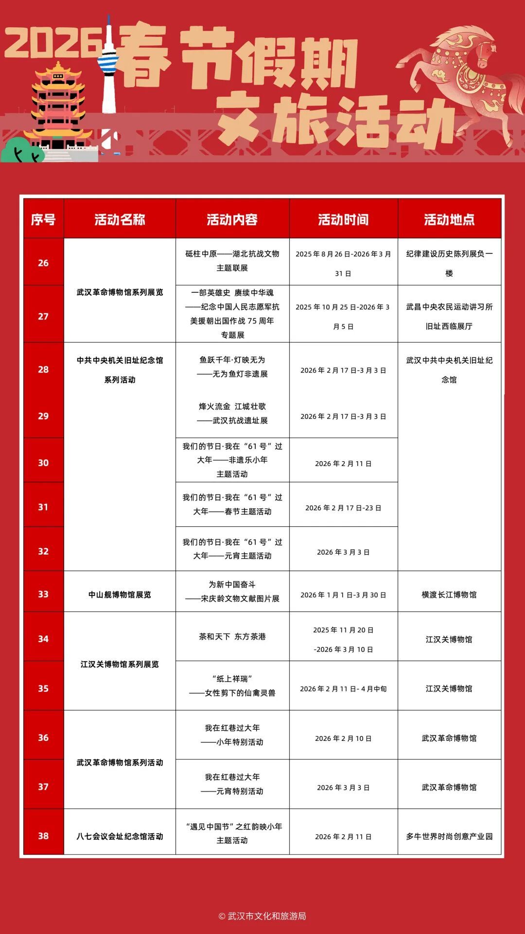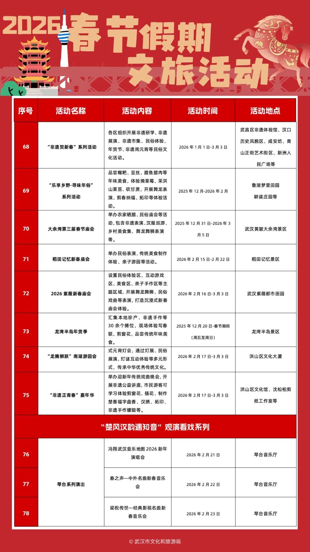活动之外,春节游武汉的攻略也已备好,2026武汉十大主题游线、“骐骥武汉 驰骋江湖”春节限量版地铁旅游卡,都安排上了。诚邀世界各地的朋友,畅游英雄城,欢乐过大年。