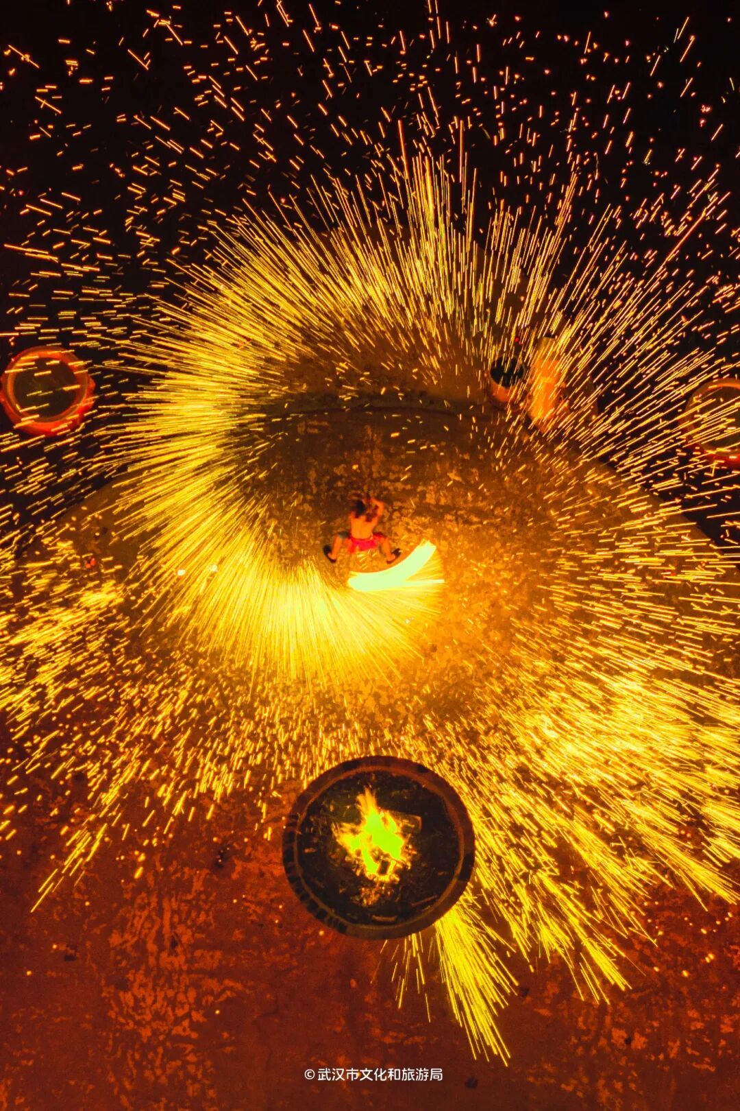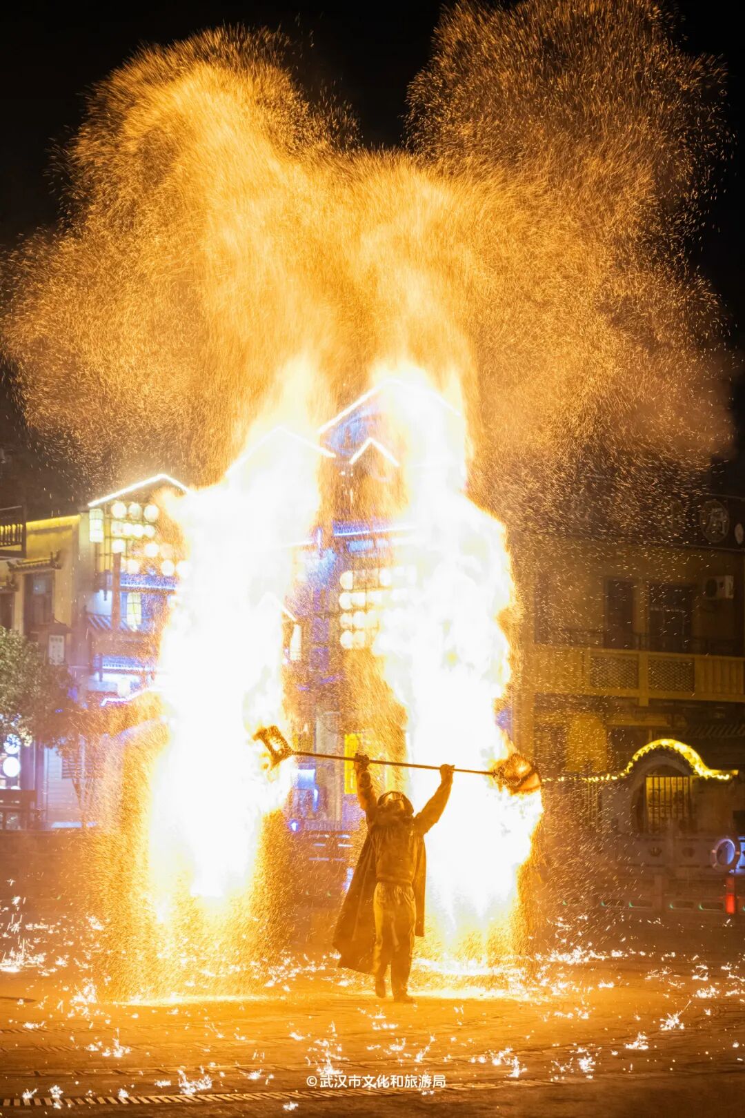 🎇10余种非遗火秀轮番上演,火龙钢花/飞天火壶/火裙/打铁花……看老师傅们在武汉秀绝活。