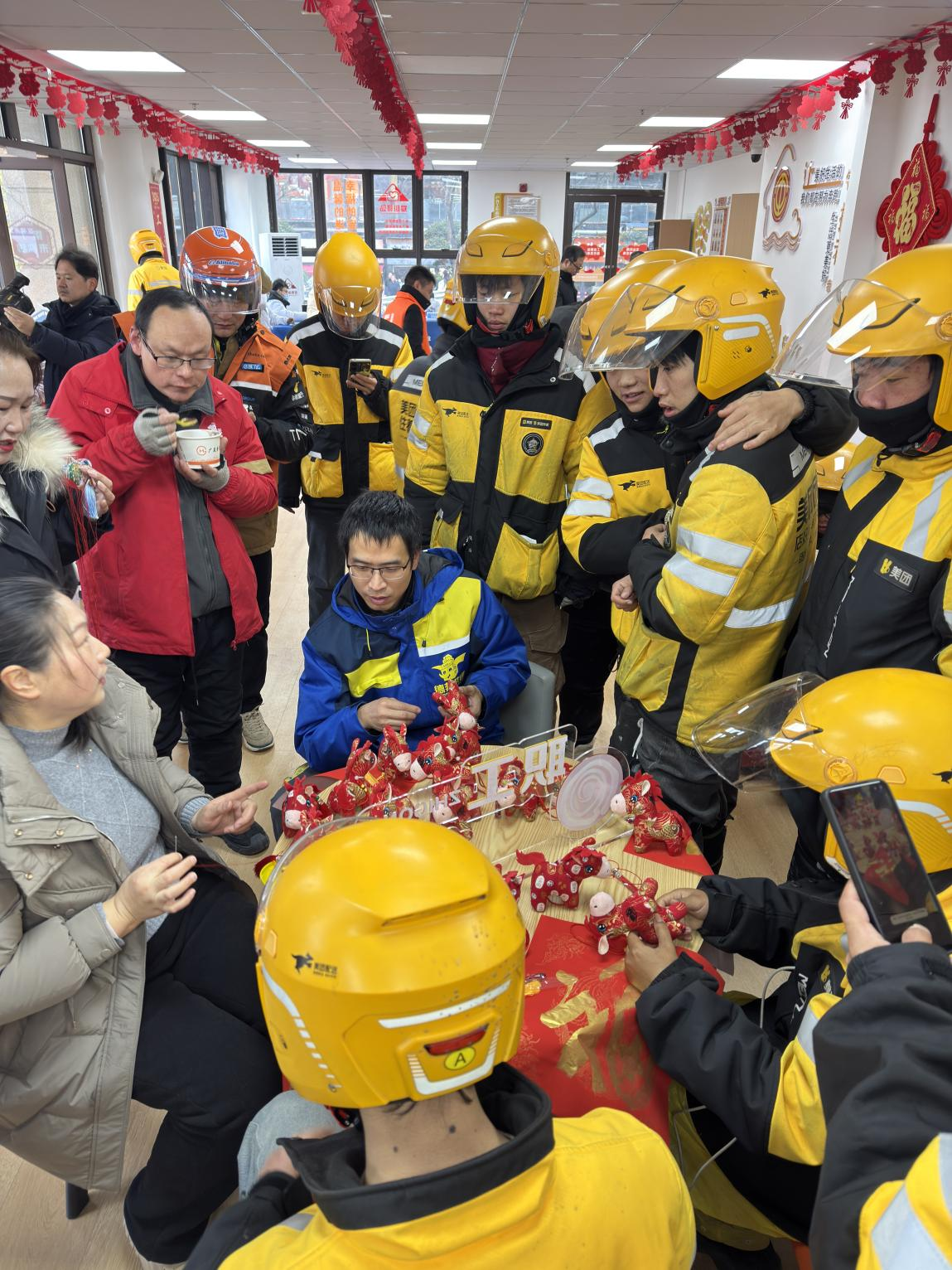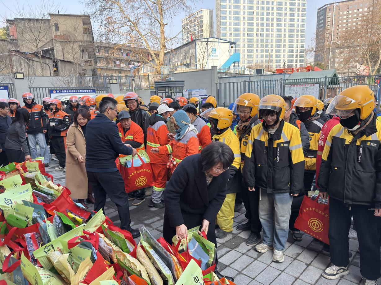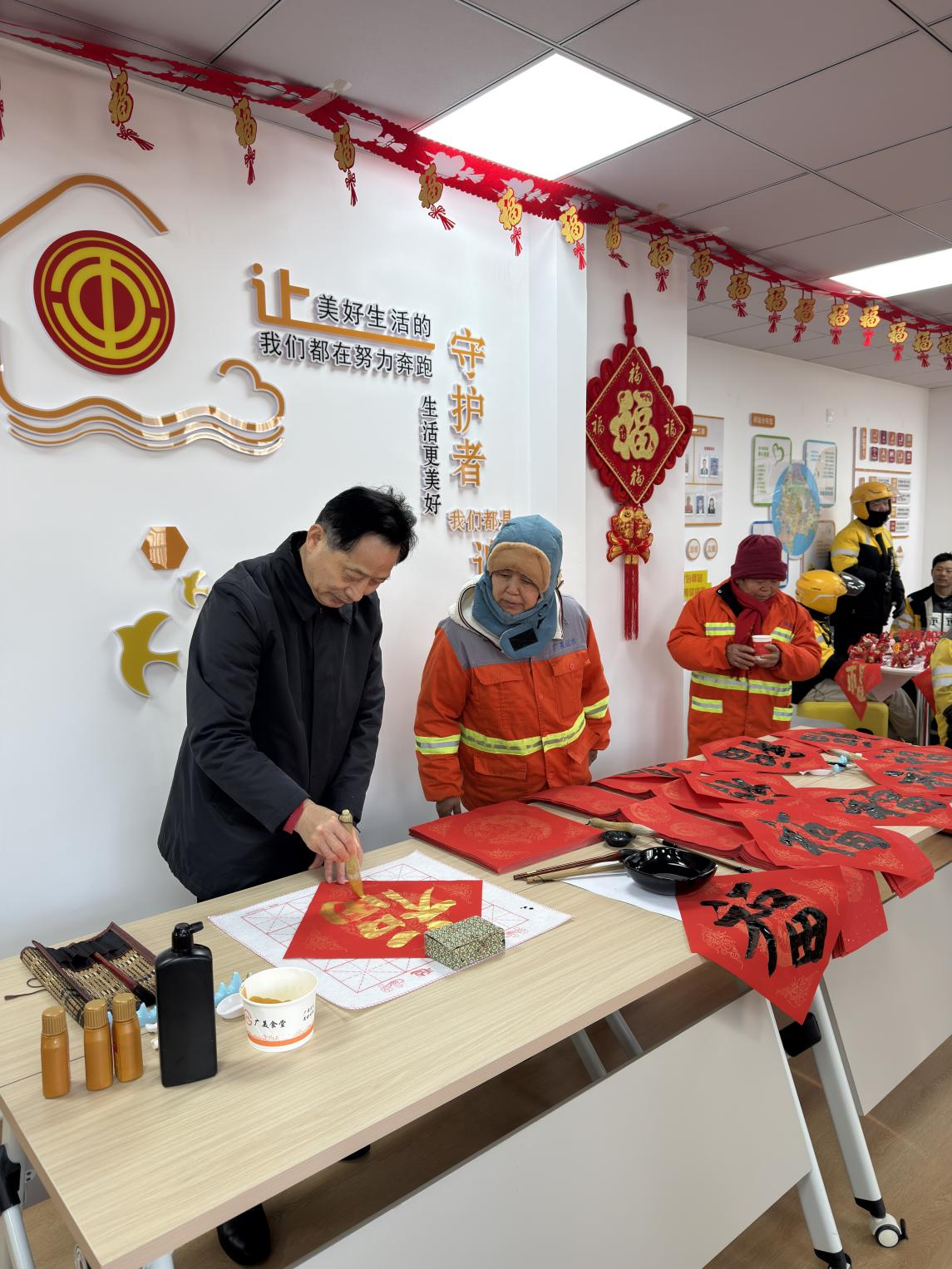 当天上午,爱心驿站粥香四溢,翰墨飘香,笑声不断。洪山区总工会在这里开展“暖‘新’相聚 福‘腊’万家”主题活动,为220余名外卖骑手、快递员、环卫工人等户外劳动者送上节日关怀。