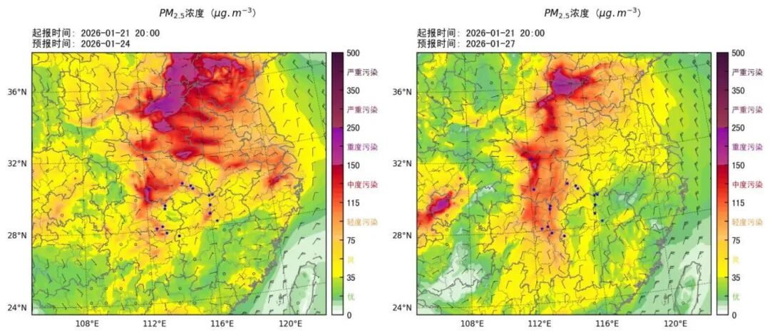 1月24日、27日湖北省及北方上游污染物积累模式预测图