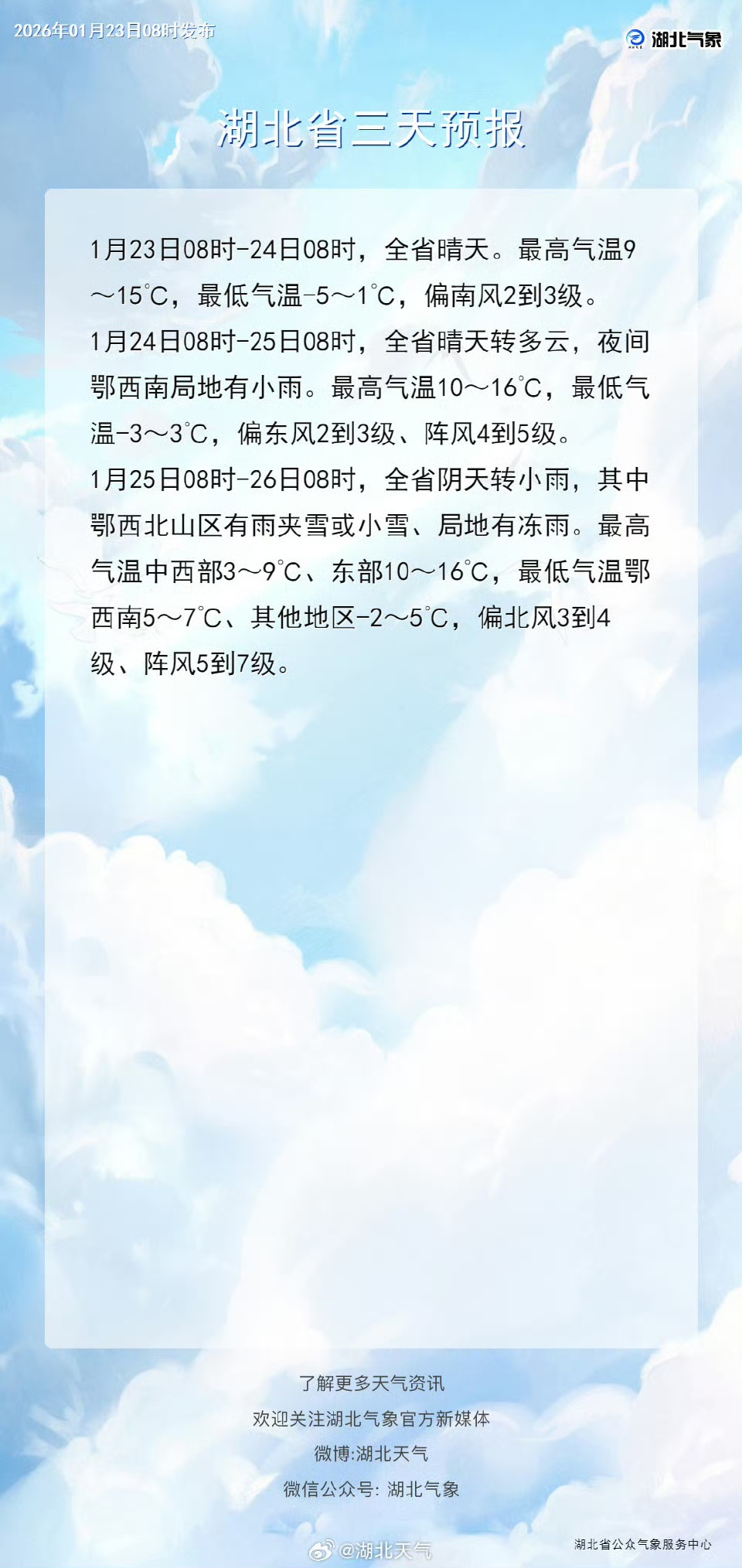 据湖北省气象局1月23日消息,预计今明两天全省以晴到多云天气为主,气温继续回升,最高气温将升至9~16℃,但明天早晨最低气温依然较低,在-5~1℃。