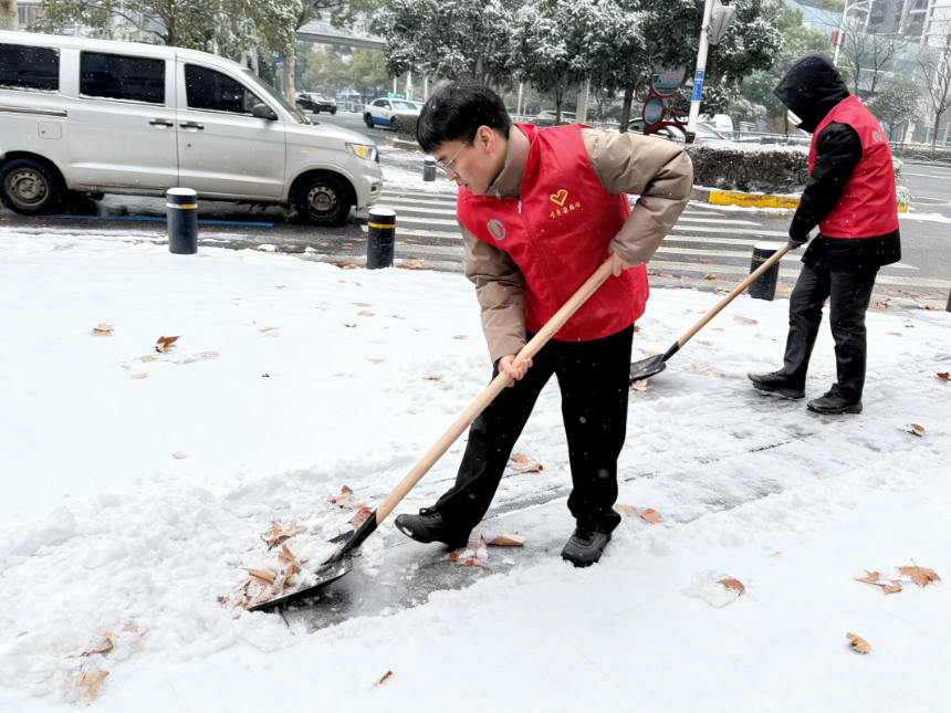 ▲武汉分行青年志愿服务队分工有序,协力铲除冰层、清运雪堆