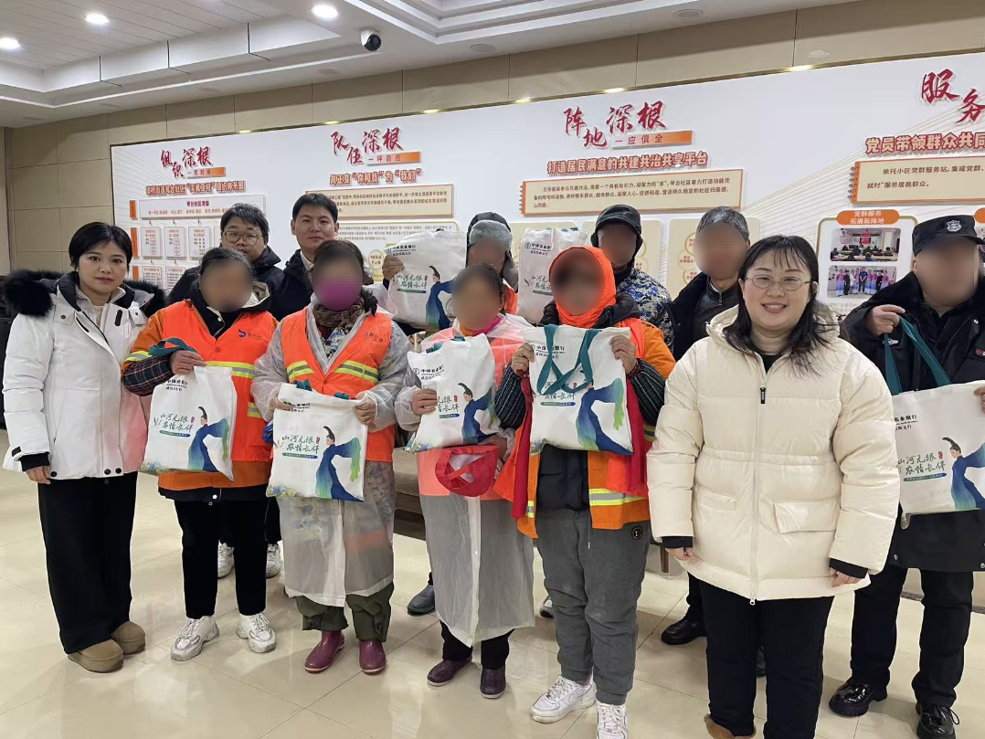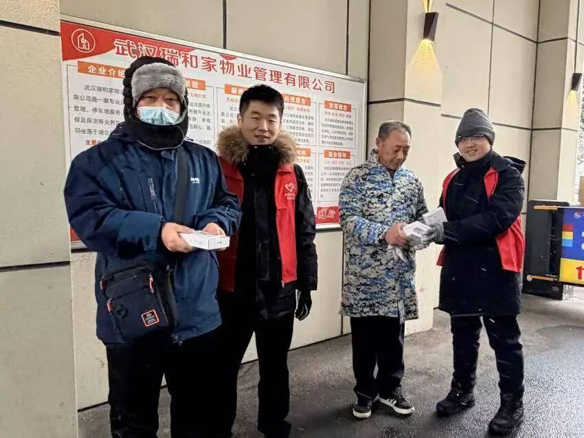 ▲武汉硚口支行青年员工为营北社区保卫人员、环卫工人送上暖手宝