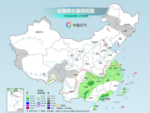这股冷空气还将给长江以北地区带来雨雪天气,25日至27日,华北、东北地区南部、黄淮北部多地将飘雪,普遍有小到中雪,河南南部、湖北西部等地局部有冻雨。