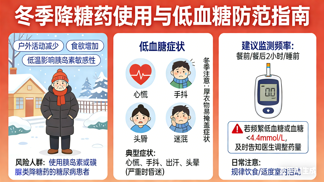 冬季户外活动减少、食欲增加,加上低温会影响胰岛素敏感性,糖尿病患者易出现血糖波动,尤其是使用胰岛素或磺脲类降糖药的人群,低血糖风险会明显升高。低血糖的典型症状的是心慌、手抖、出汗、头晕,严重时可能昏迷,冬季保暖衣物厚重,症状易被忽视。建议冬季增加血糖监测频率,餐前、餐后2小时及睡前均可监测,若频繁出现低血糖症状,或血糖持续低于4.4mmol/L,及时告知医生,调整降糖药剂量,同时注意规律饮食、适度室内活动。