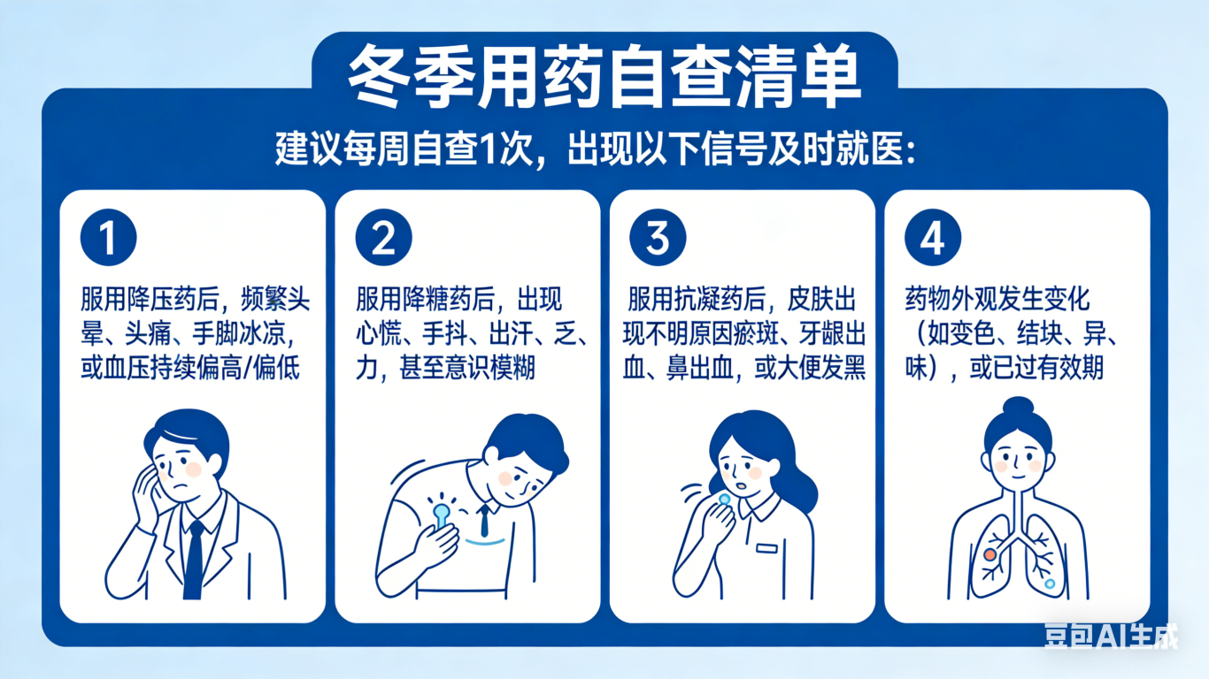冬季用药无小事,尤其是慢性病患者,身体对药物的反应会随季节变化而改变。牢记:药物调整需遵医嘱,不可自行增减药量、更换药物;规范存放药物,做好用药自查,才能让药物发挥最佳效果,平安过冬。转发给身边需要的人,一起守护用药安全~