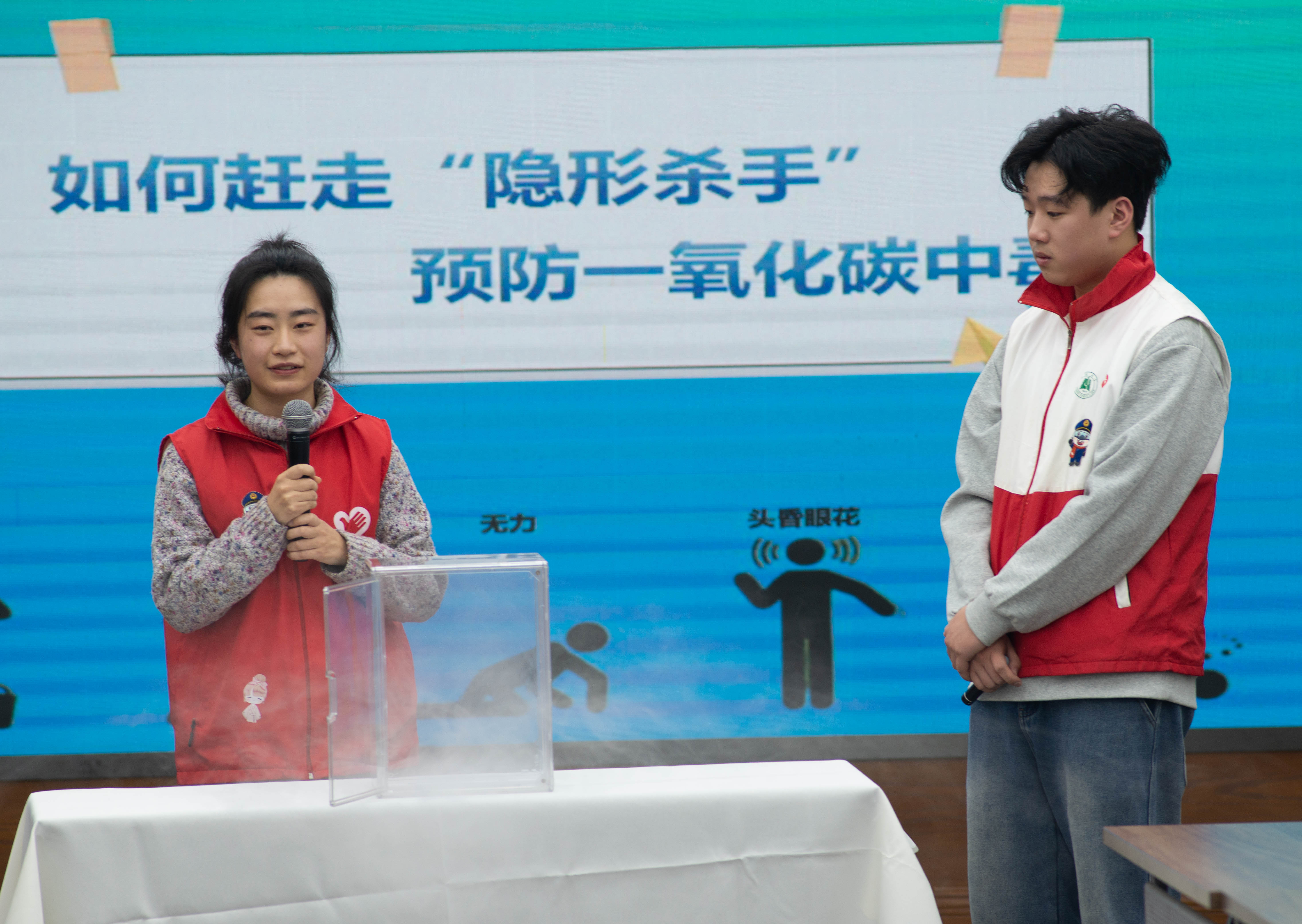 “同学们快看,烟雾慢慢充满盒子了,这就像密闭房间里的一氧化碳!”在一氧化碳中毒防范环节,来自华中师范大学的志愿者手持透明实验盒与烟雾发生器,现场模拟炭火取暖场景。随着“门窗”打开,盒内烟雾迅速消散,孩子们恍然大悟:“原来开窗通风就能赶走‘隐形杀手’!”结合案例视频与实验演示,天翼老师详细讲解了一氧化碳中毒原理及急救措施,并带领大家齐声背诵安全口诀:“烧炭取暖时,通风不可少;头晕又恶心,赶紧往外逃”。