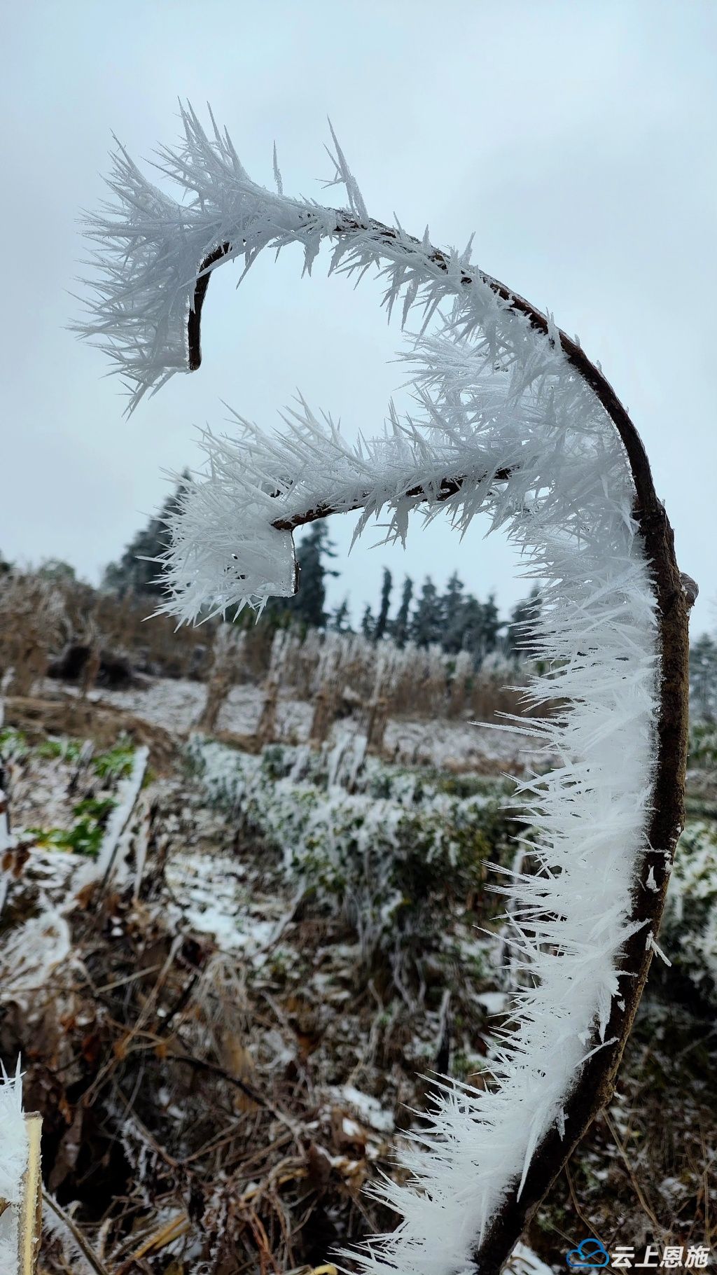 常青的松柏仍擎着苍翠,枯萎的枝茎倔强伸展,皆被一层莹白的冰壳包裹,化作千姿百态的天然艺术品。扇形棕树叶如孔雀开屏,竹叶层层叠叠铺展着剔透的翎羽;藤蔓细枝交错处,冰丝牵牵连连,恰似架起的银色琴弦,似有泠泠乐声在风中流转;更有纤细的冰枝弯成月牙模样,映着天光泛着清辉,偶有枯草丛中,薄冰覆叶如羽毛轻展,脆弱却不失灵动。