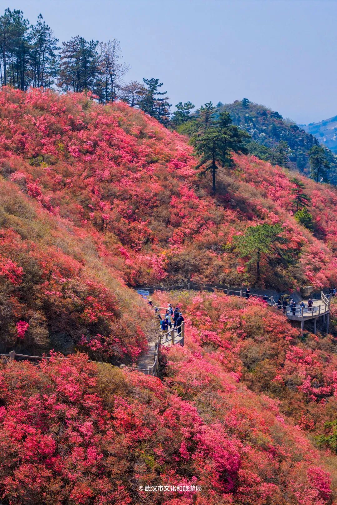 “武汉的呼伦贝尔”木兰草原草地广阔,四季花海不断。花乡茶谷10万株梅花开得正盛,营造出一片粉色浪漫世界。