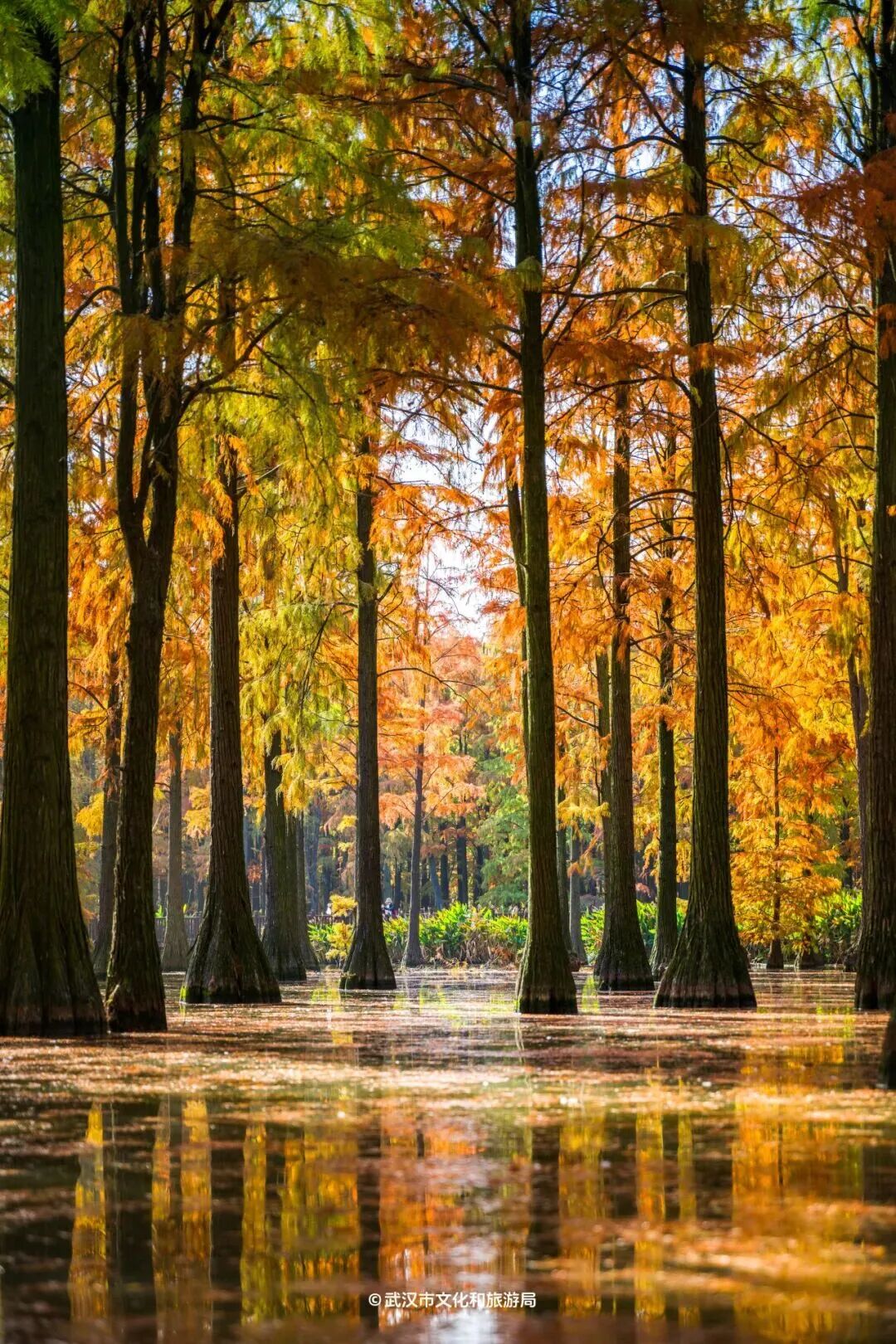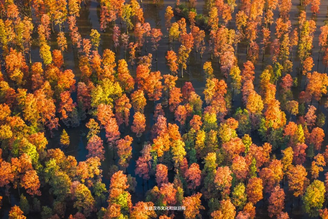 长江北岸,涨渡湖湿地上万棵池杉组成壮观的“水上森林”,每到12月,树叶陆续变红,一棵棵火炬,把冬天照得热烈明媚。
